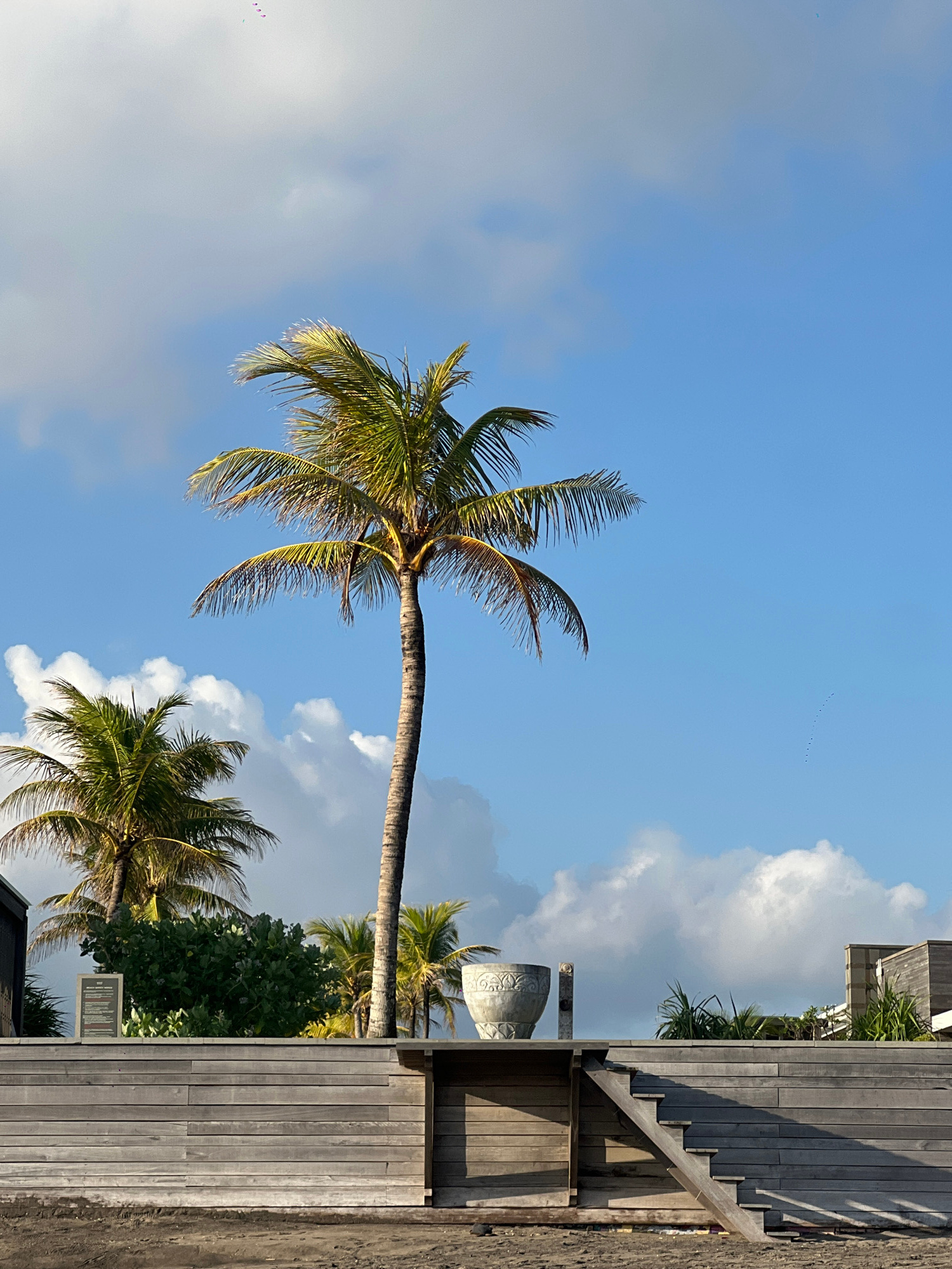 A horizontally-oriented medium shot depicts a beach scene in North Kuta, Indonesia. A tall, slender palm tree with green and brown fronds dominates the left side of the frame. The tree's trunk extends…read more