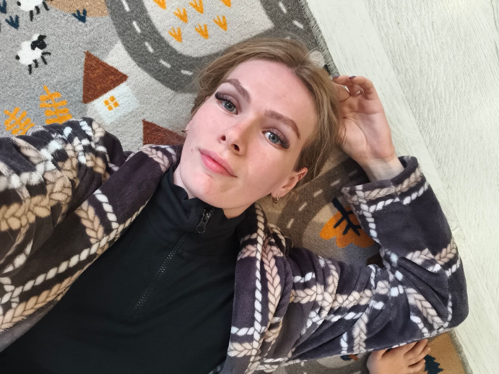 A fair-skinned person with light brown hair is lying on a rug with a road and building design. The person is wearing a black turtleneck shirt and a gray and white patterned robe. The person's right ha…read more