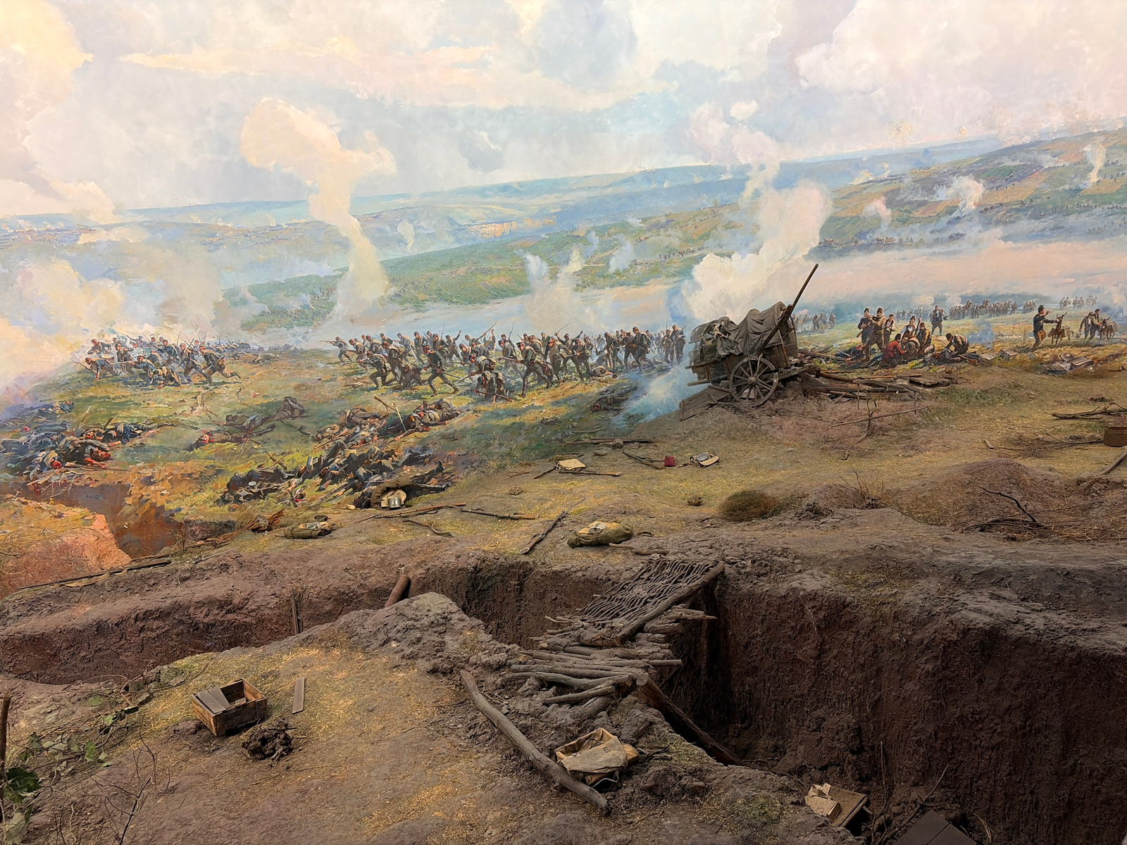 This image is a panoramic painting depicting a historical battle scene. The foreground features a trench with wood planks and a box. In the midground, soldiers are engaged in combat, some advancing an…read more