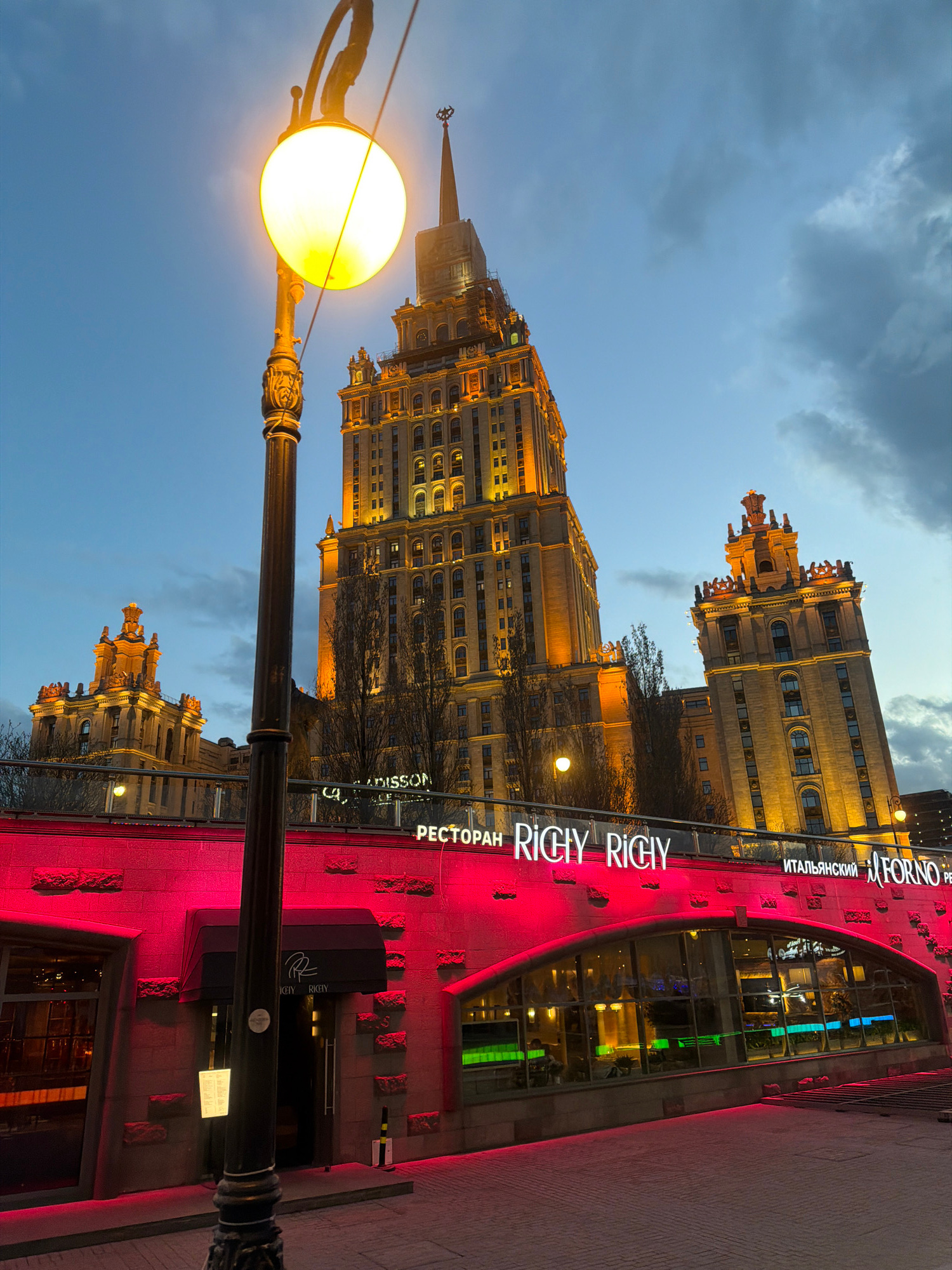 The image shows a nighttime view in Moscow, Russia, featuring Stalinist architecture and modern establishments. In the foreground, a vintage-style street lamp with a glowing spherical light is visible…read more