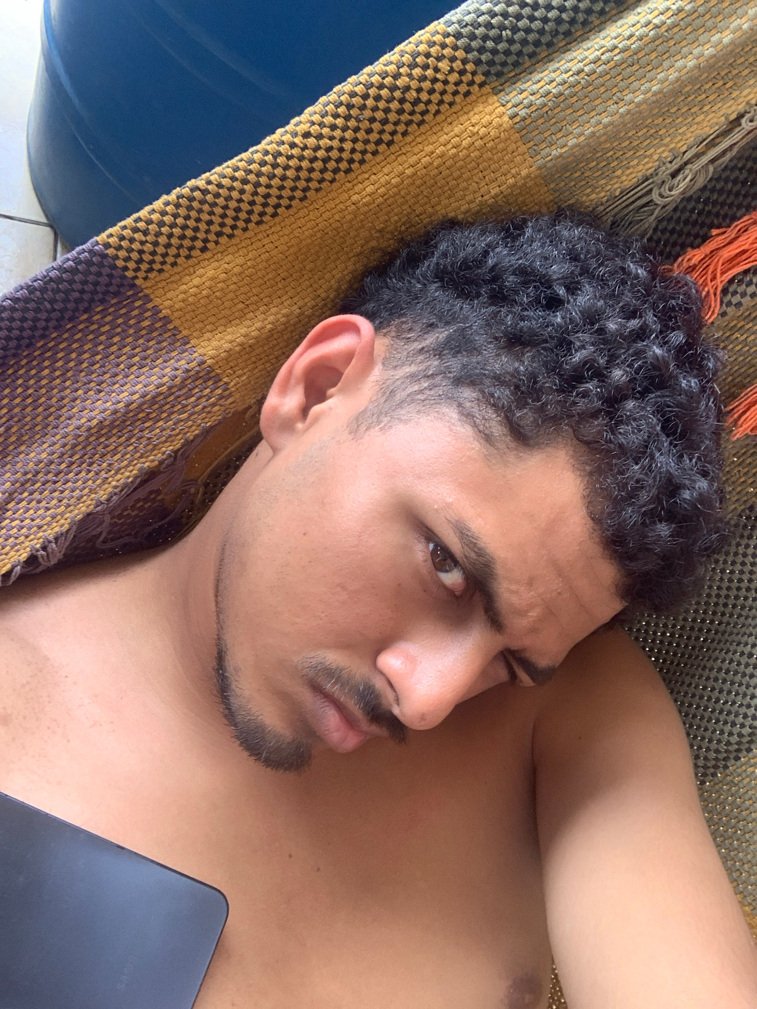 A man is lying down, possibly in a hammock, and holding a black smartphone. His head is resting on a woven fabric with orange and beige threads, and a blue object is visible in the background. He has…read more