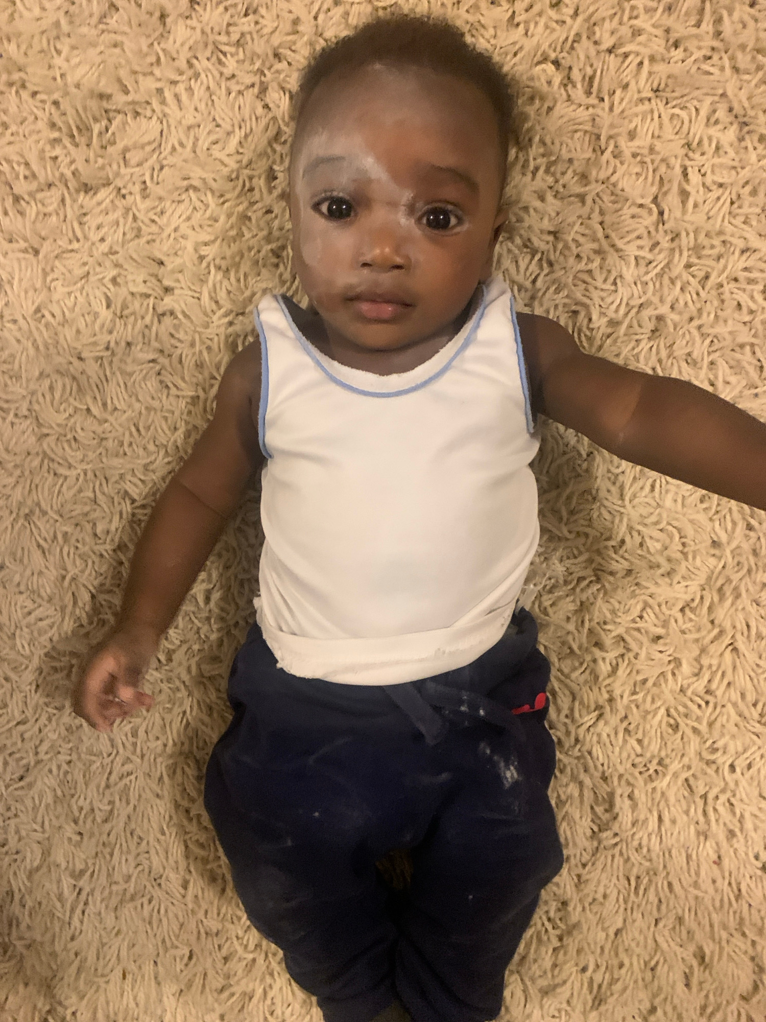 A dark-skinned baby lies on their back on a beige shag carpet. The baby wears a white tank top with blue trim and dark blue sweatpants. A white powdery substance is smeared across the baby's face. Theβ¦read more