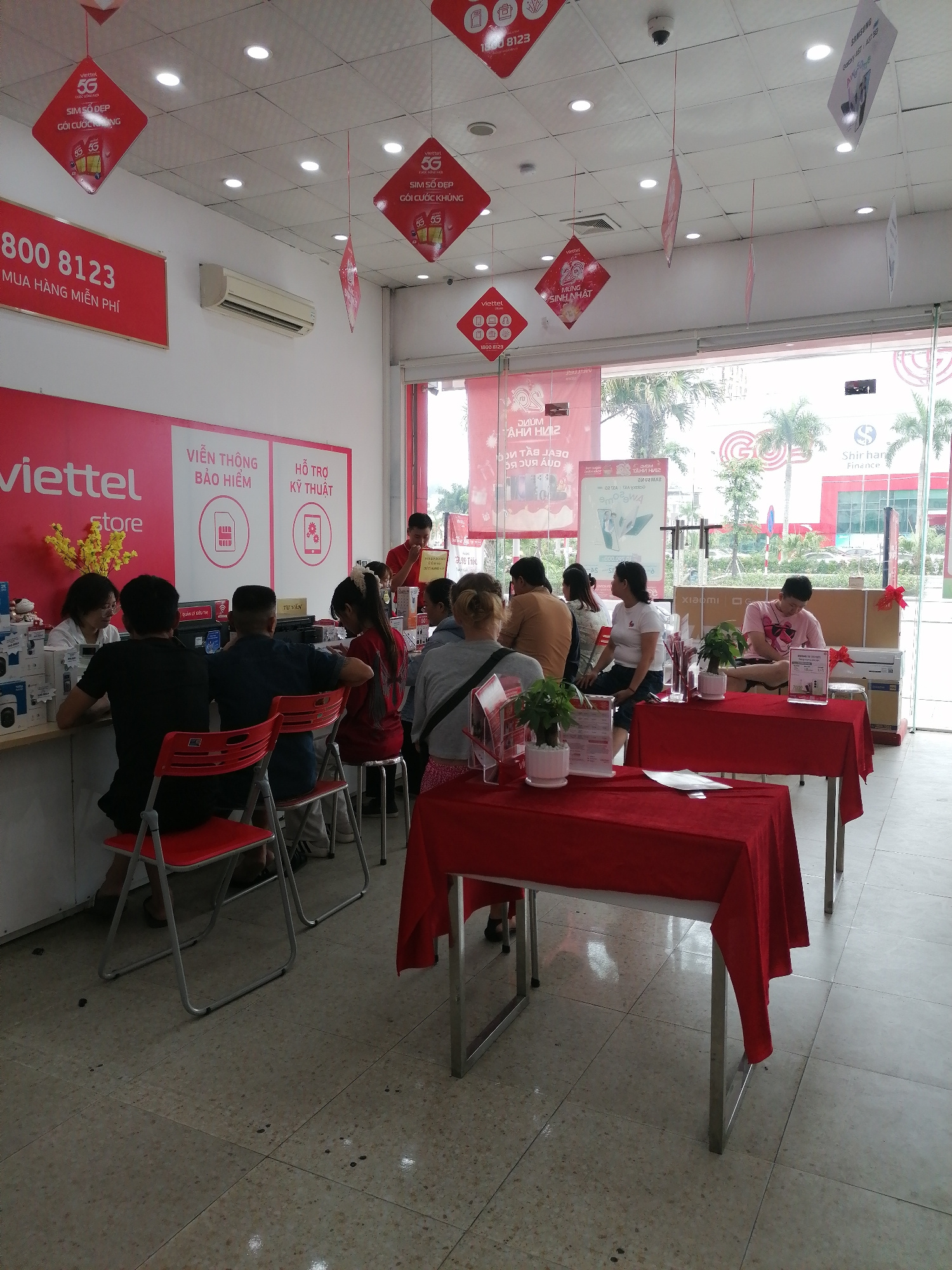 The image shows the interior of a Viettel store in Ha Long Ward, Vietnam. Several people are seated at tables and chairs, some of whom appear to be customers waiting for service, while others are enga…read more