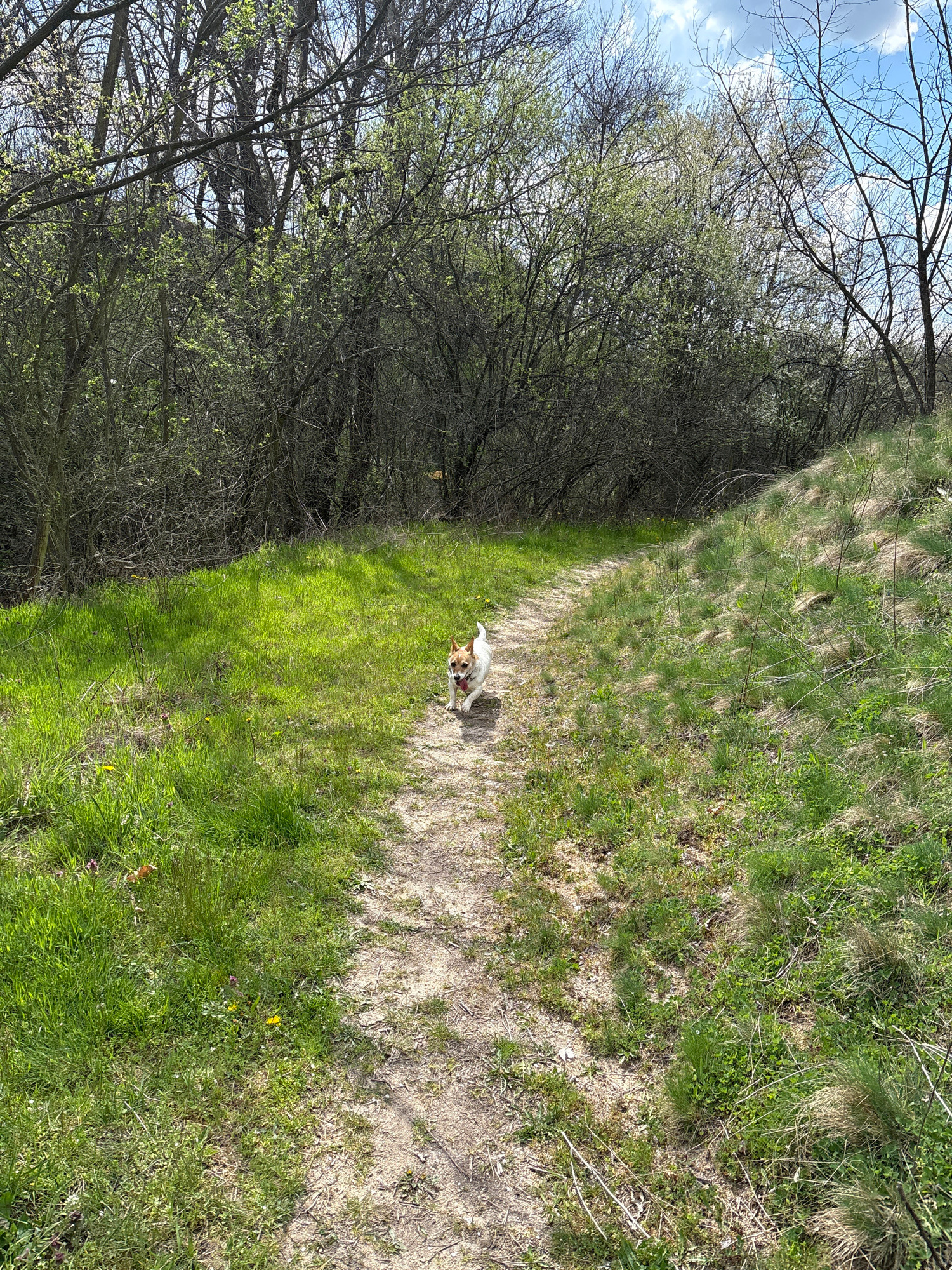 A daytime shot in Panagyurishte, Bulgaria, depicts a dirt path bordered by grassy areas and trees on the left side. A small, light-colored dog is running on the path. Bare tree branches are visible ag…read more