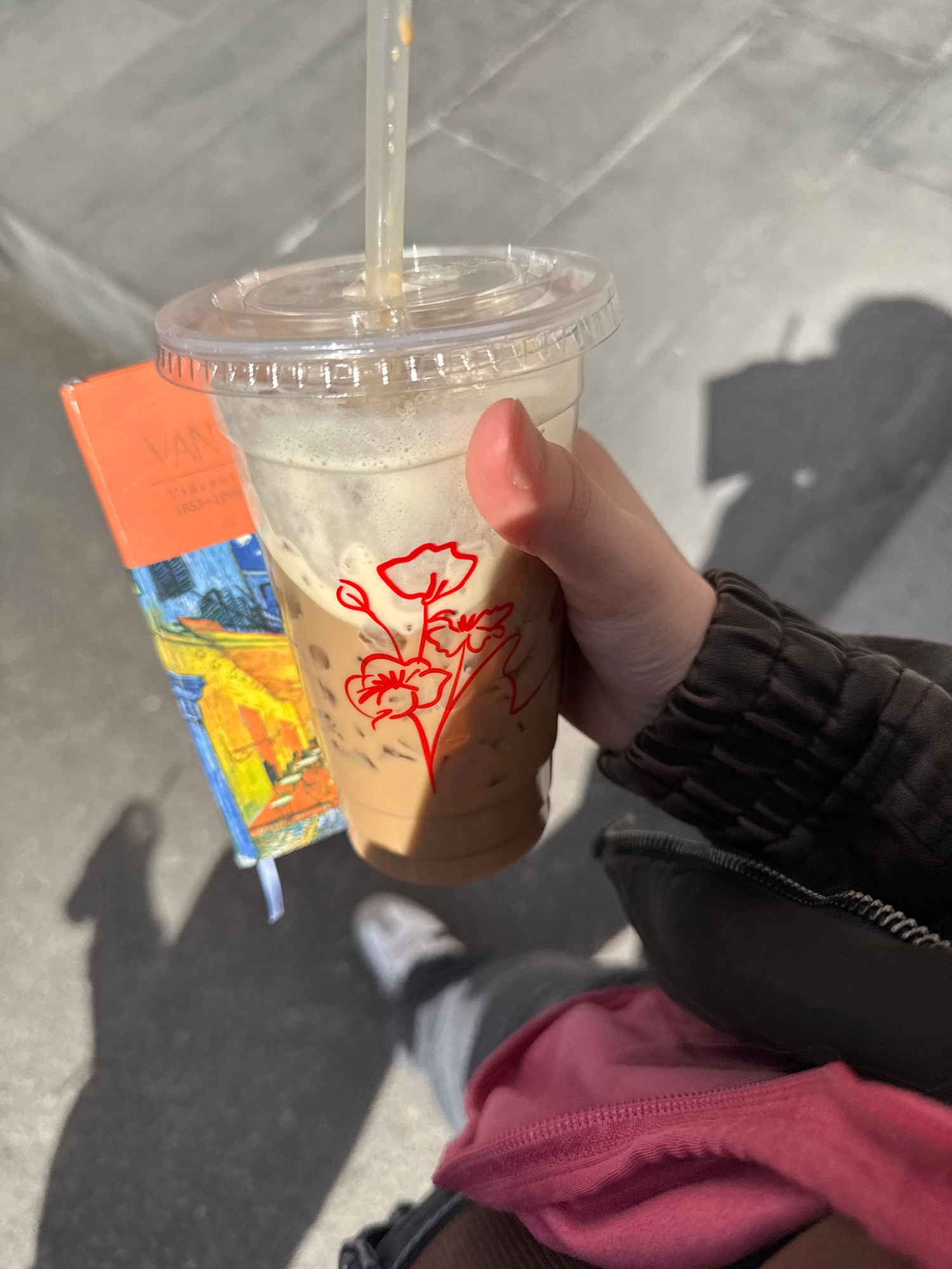 A person holds a clear plastic cup with an iced coffee drink, using it as a weight on top of a book about Van Gogh. The cup has a clear, ridged lid and a straw inside. The book has a distinctive cover…read more