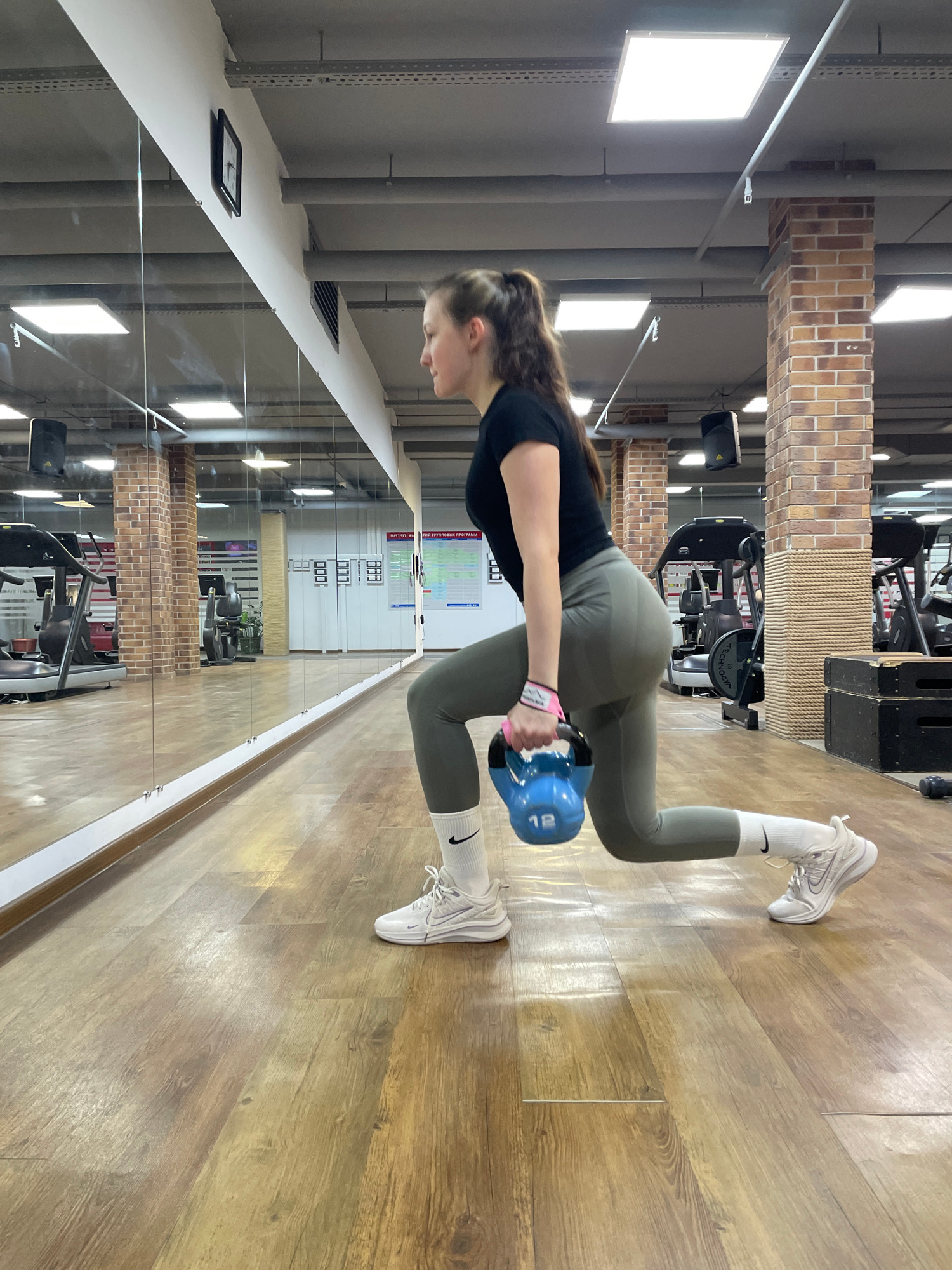The image shows a woman performing a kettlebell swing exercise in a gym, likely located in Izhevsk, Russia. The gym features brick accents, mirrors, and various exercise machines. The woman is wearing…read more