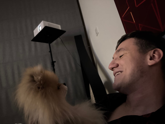 An upside-down image shows a man with short hair and light skin smiling slightly. Adjacent to him is a fluffy, light brown Pomeranian dog. In the background, there is a projector mounted on a stand. T…read more