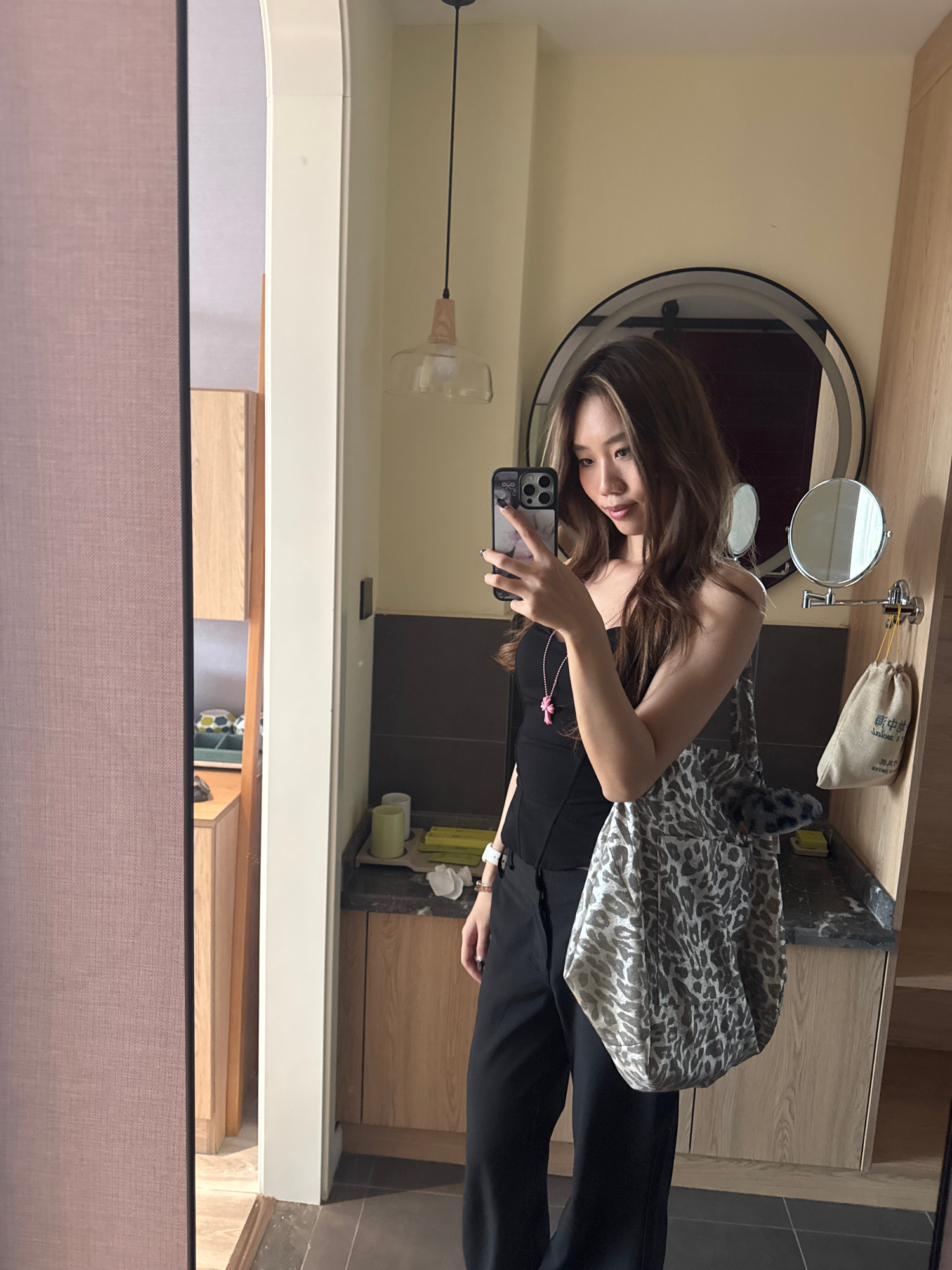 An indoor mirror selfie captures a young woman in what appears to be a modern hotel bathroom or dressing area in Jiayuguan, China. The woman, with long brown hair featuring lighter highlights, is refl…read more