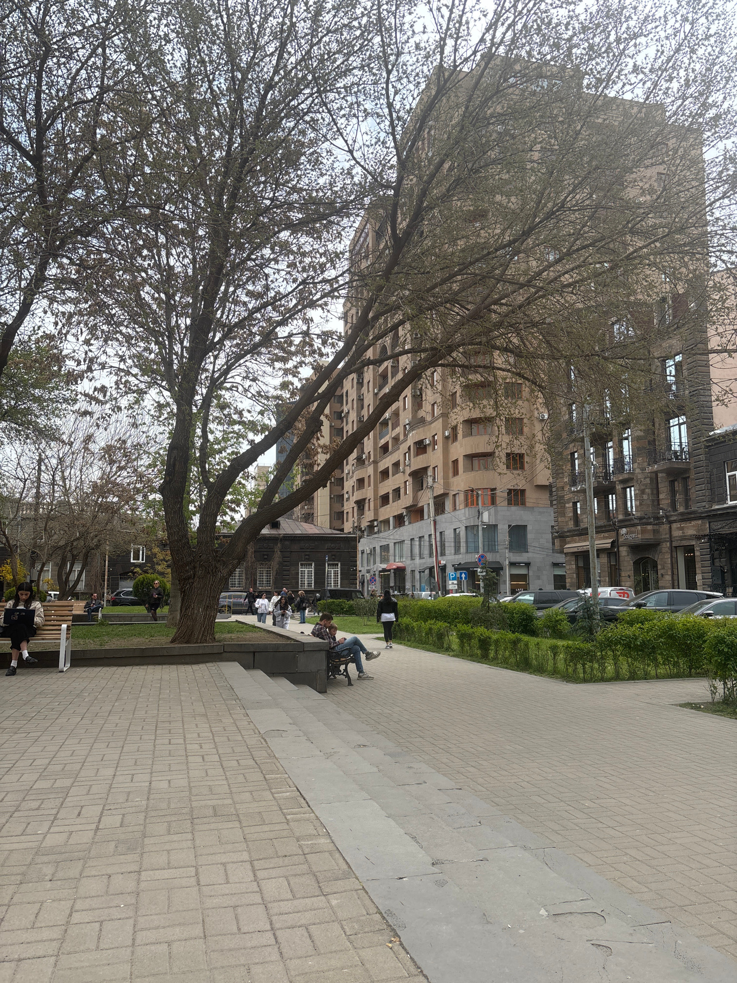 The image shows a city scene in Yerevan, Armenia, featuring a paved pedestrian area adjacent to a green space with trees. Several multi-story buildings are visible in the background. People are seated…read more