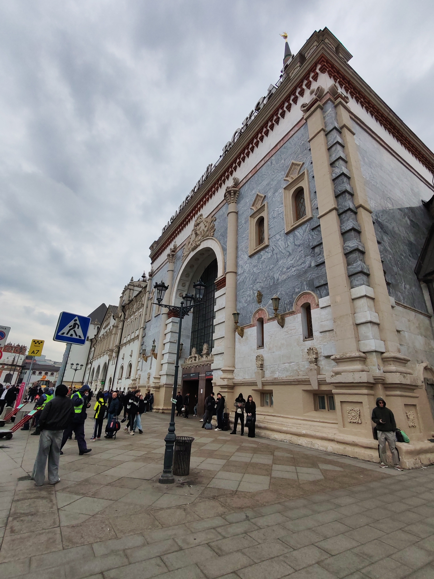 The image depicts an urban scene on an overcast day in Moscow, Russia, featuring a grand, ornate building that appears to be a railway station. The building's facade is characterized by a blend of lig…read more