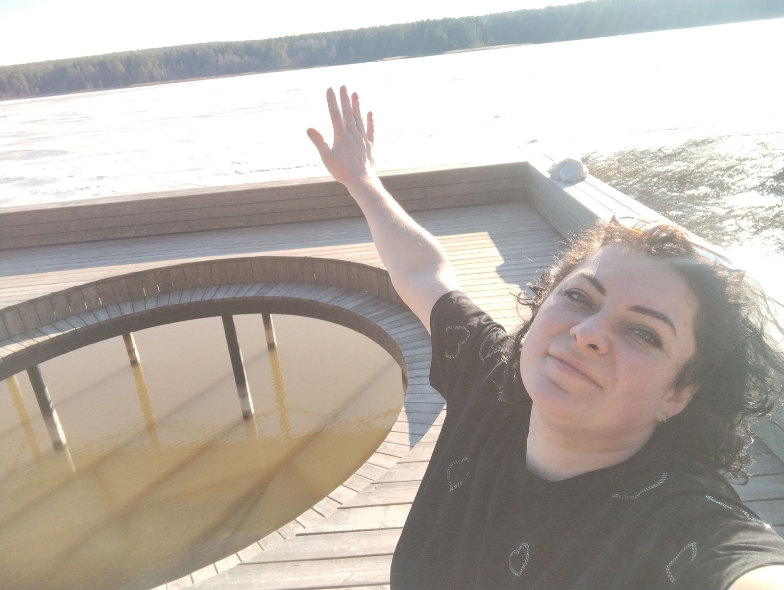A woman takes a selfie outdoors, on a wooden deck overlooking a body of water. The deck features a circular opening into the water below. The woman is wearing a black t-shirt decorated with heart patt…read more