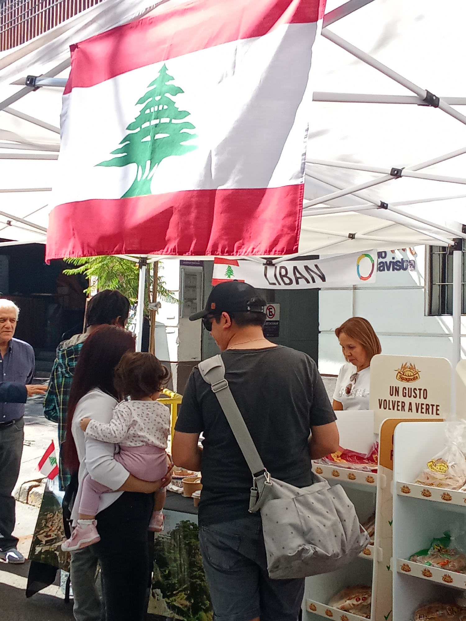 The image shows a daytime scene at an outdoor market or event in Providencia, Chile. A Lebanese flag hangs from a white tent structure. Several people are present. A woman is holding a child, while anβ¦read more