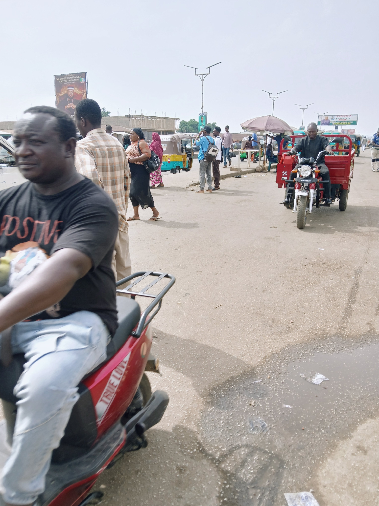 The image captures a street scene in Jos, Nigeria. A man in a black t-shirt and light blue jeans is seen in the foreground, seemingly near a red motorcycle. Further down the street, a group of people…read more