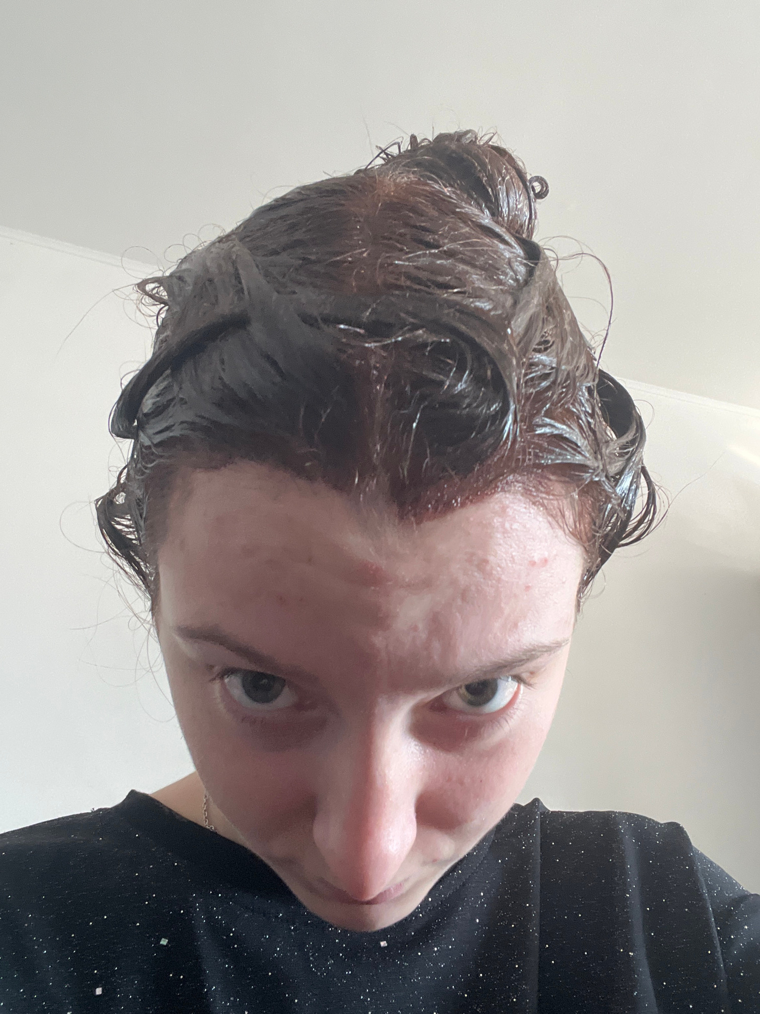A close-up, tilted image of a person with brown, wet hair, possibly after dyeing or showering. The person has fair skin, prominent eyes, and is looking directly at the camera. The hair appears dark br…read more