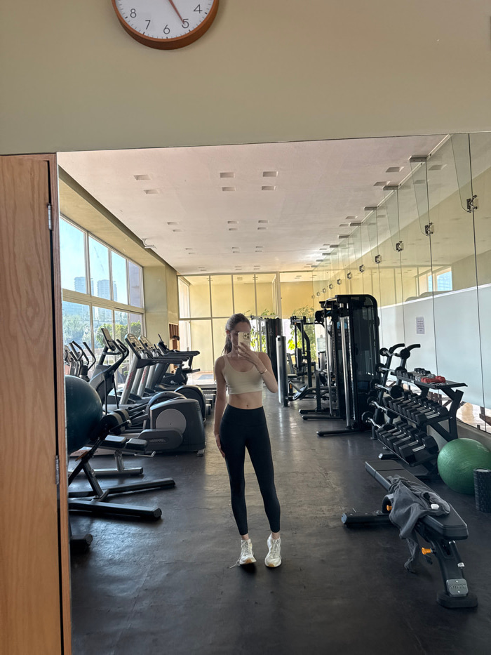 This image depicts the interior of a modern fitness center or gym located in Mexico City, Mexico. The scene is dominated by a large wall-mounted mirror, which reflects a lone female subject taking a sā¦read more