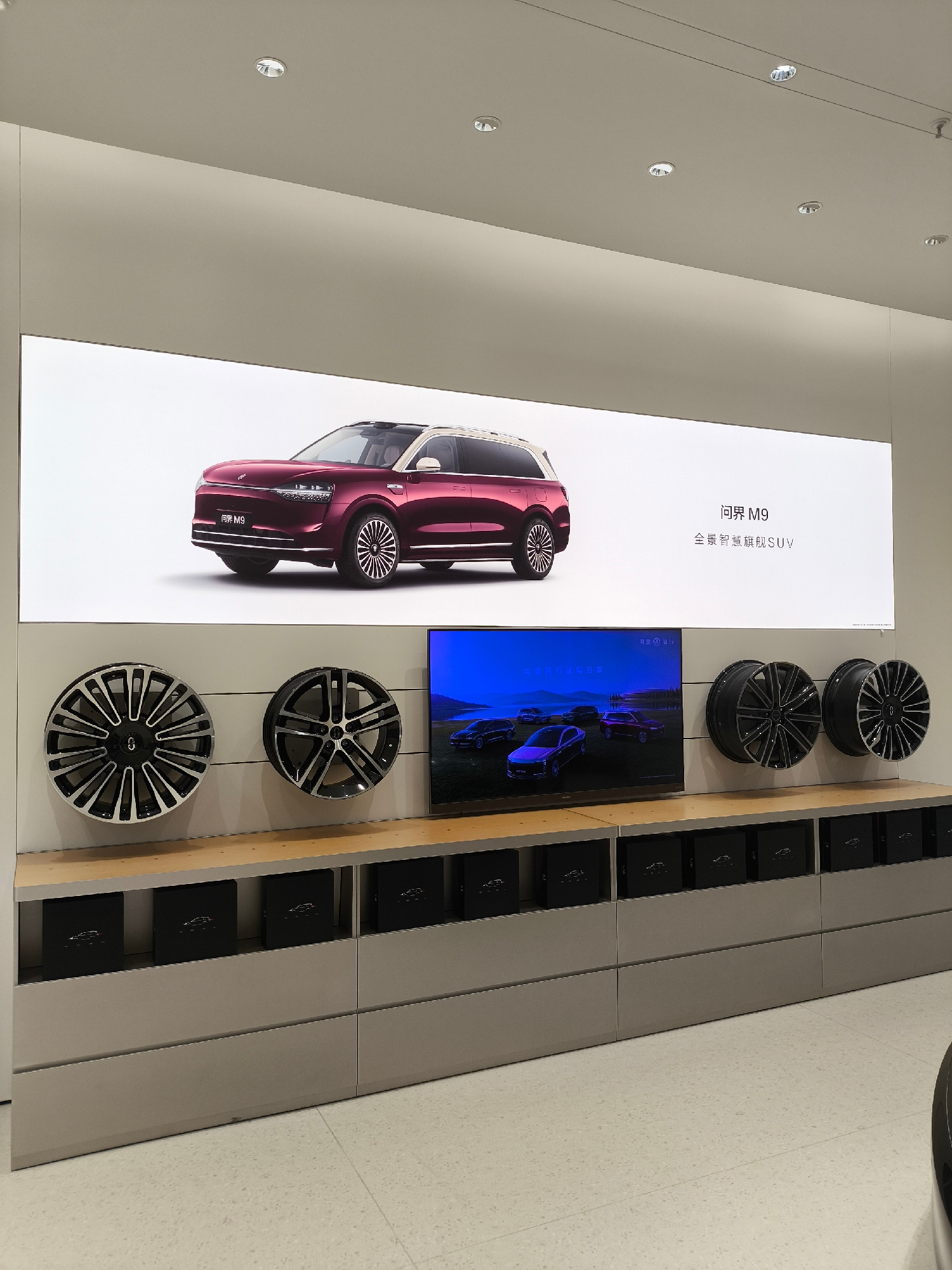 The scene shows the interior of a car dealership or showroom, likely located in Futian District, China. A large horizontal display shows a burgundy SUV, identified as "M9" in Chinese text, and a displβ¦read more