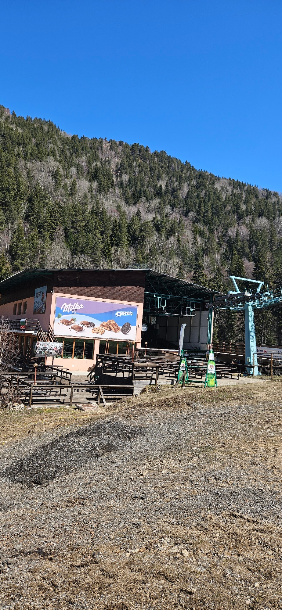 The image depicts a building with an advertisement for Milka and Oreo. The building appears to be a ski lift station or a restaurant located at a ski resort, possibly located in Blagoevgrad, Bulgaria,…read more