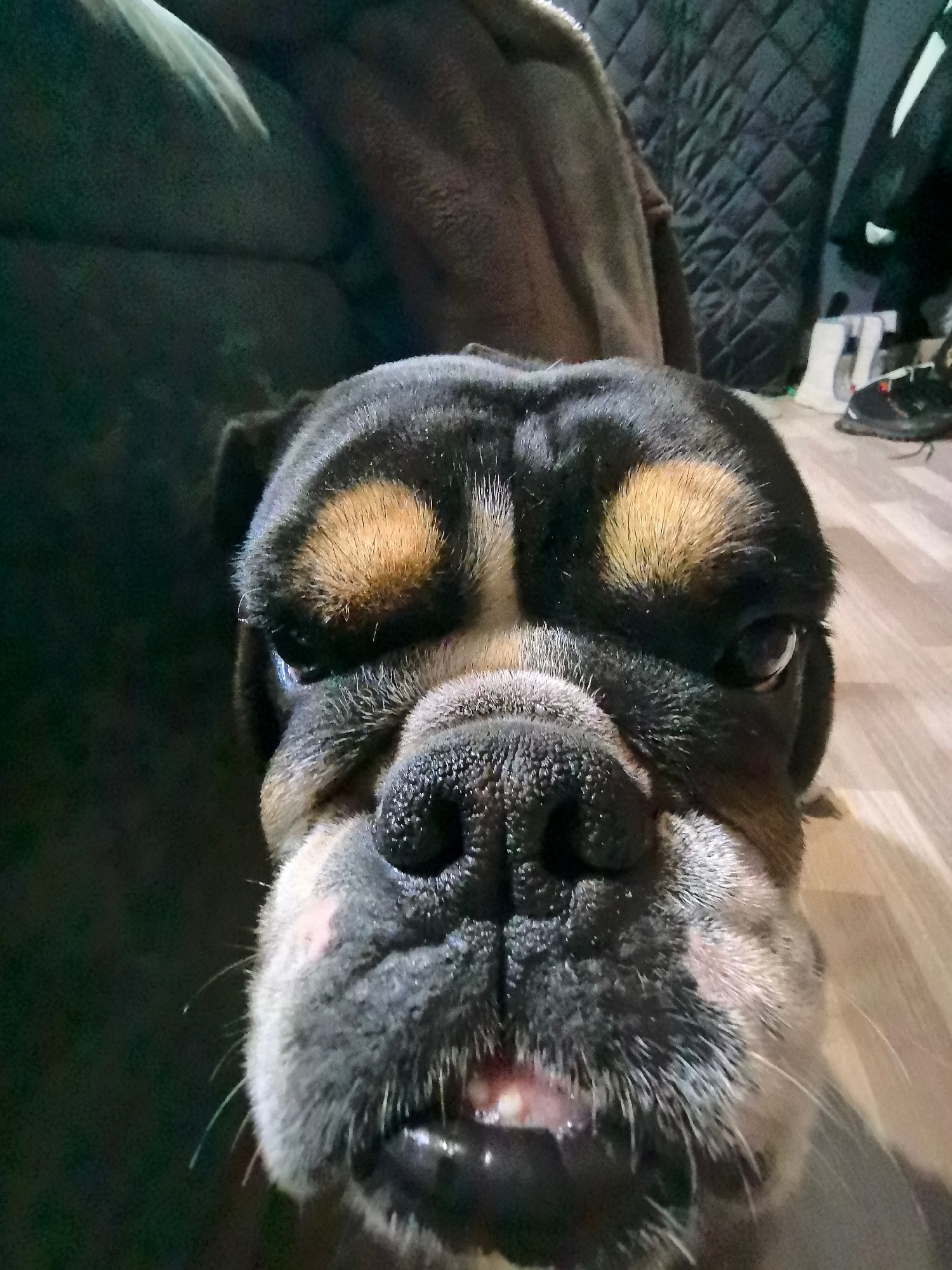 A very close-up, headshot photograph captures a charming dog looking directly at the camera. The dog, likely a bulldog or a similar brachycephalic breed, has short, dense fur with a dominant black col…read more