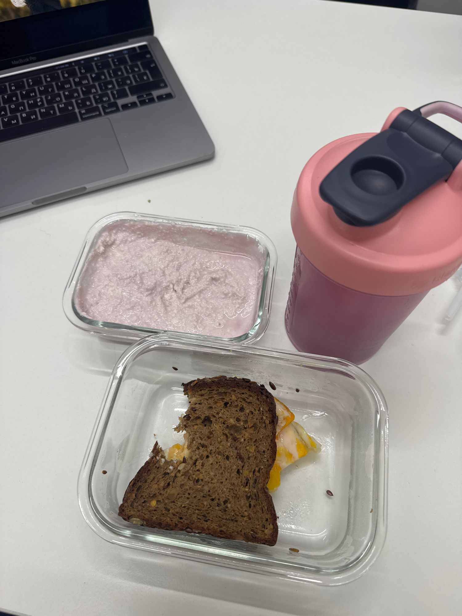 A high-angle shot shows a MacBook Pro, a pink water bottle, and two glass food containers on a white surface. The laptop is partially visible in the lower-left corner, displaying a keyboard and trackp…read more