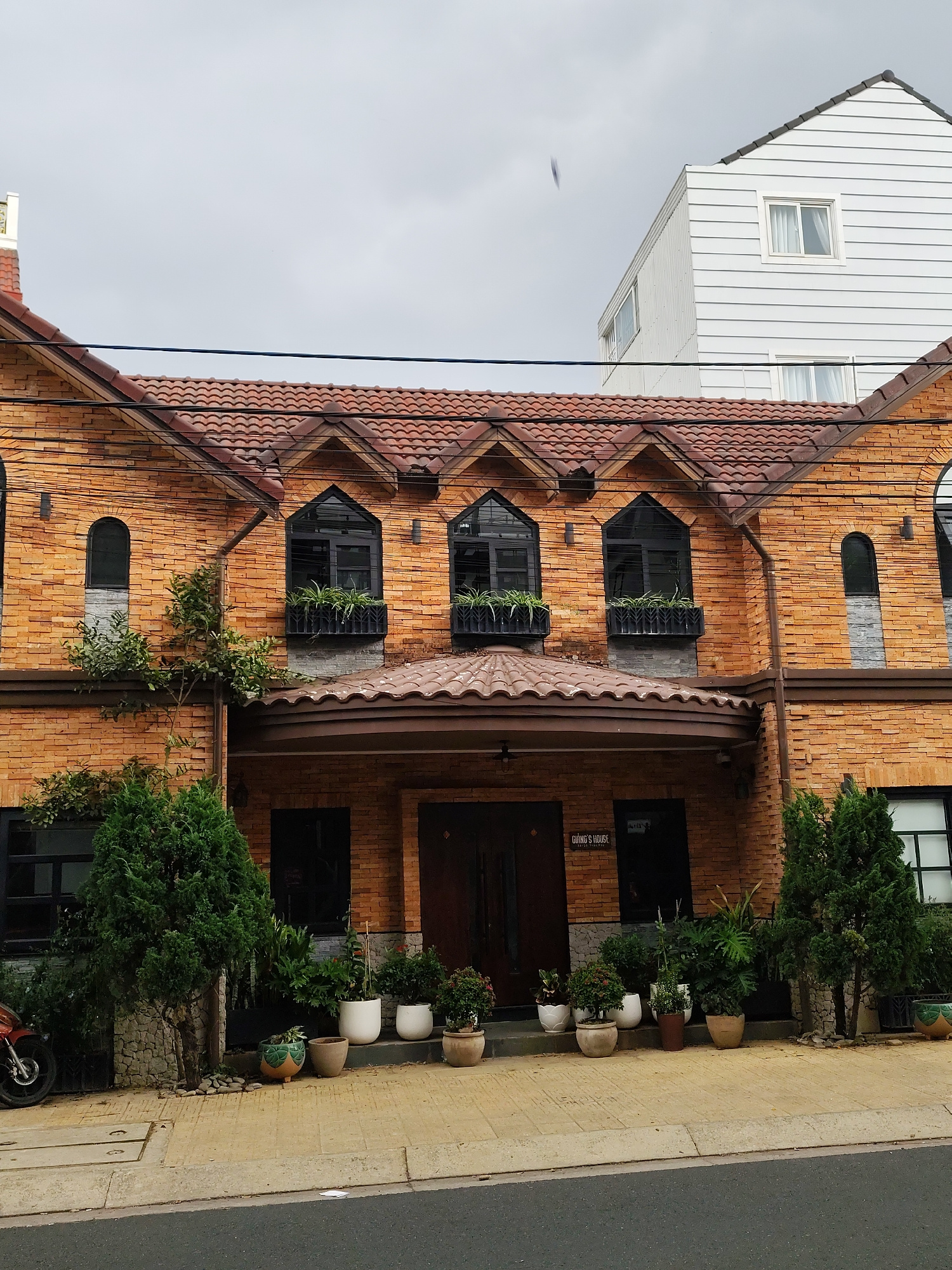 The image shows a two-story brick building with a distinctive red-tiled roof located in Da Lat, Vietnam. The facade features three arched windows on the second floor, each adorned with window boxes co…read more
