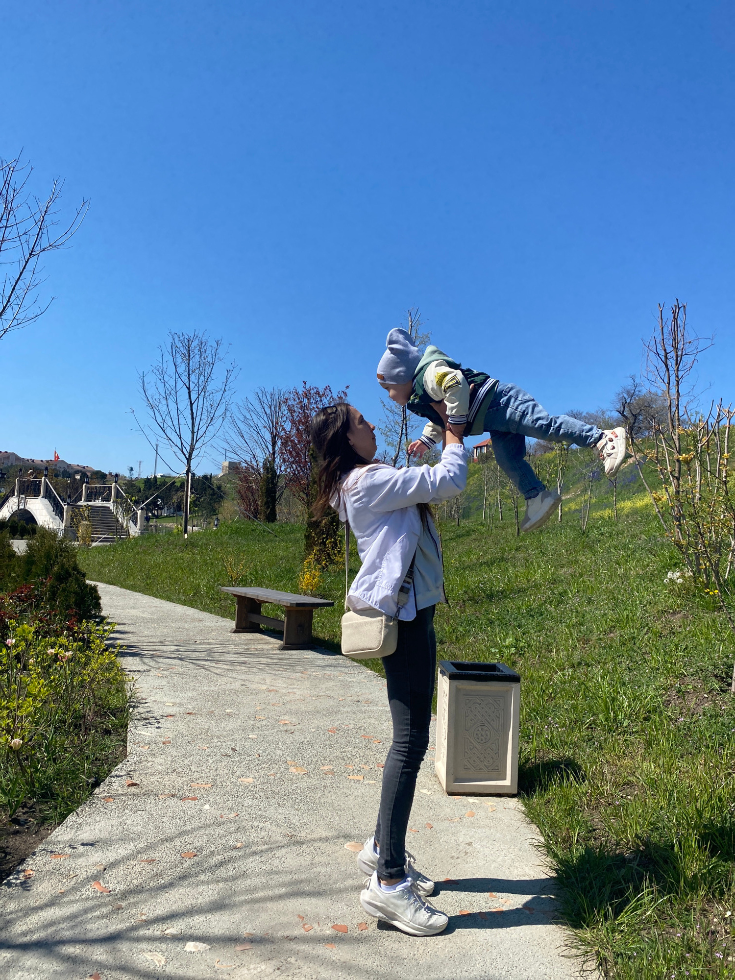 The image displays a bright, sunny outdoor scene featuring a woman and a young child in what appears to be a park or green space. The woman, with long dark hair, is dressed in a white jacket, dark pan…read more