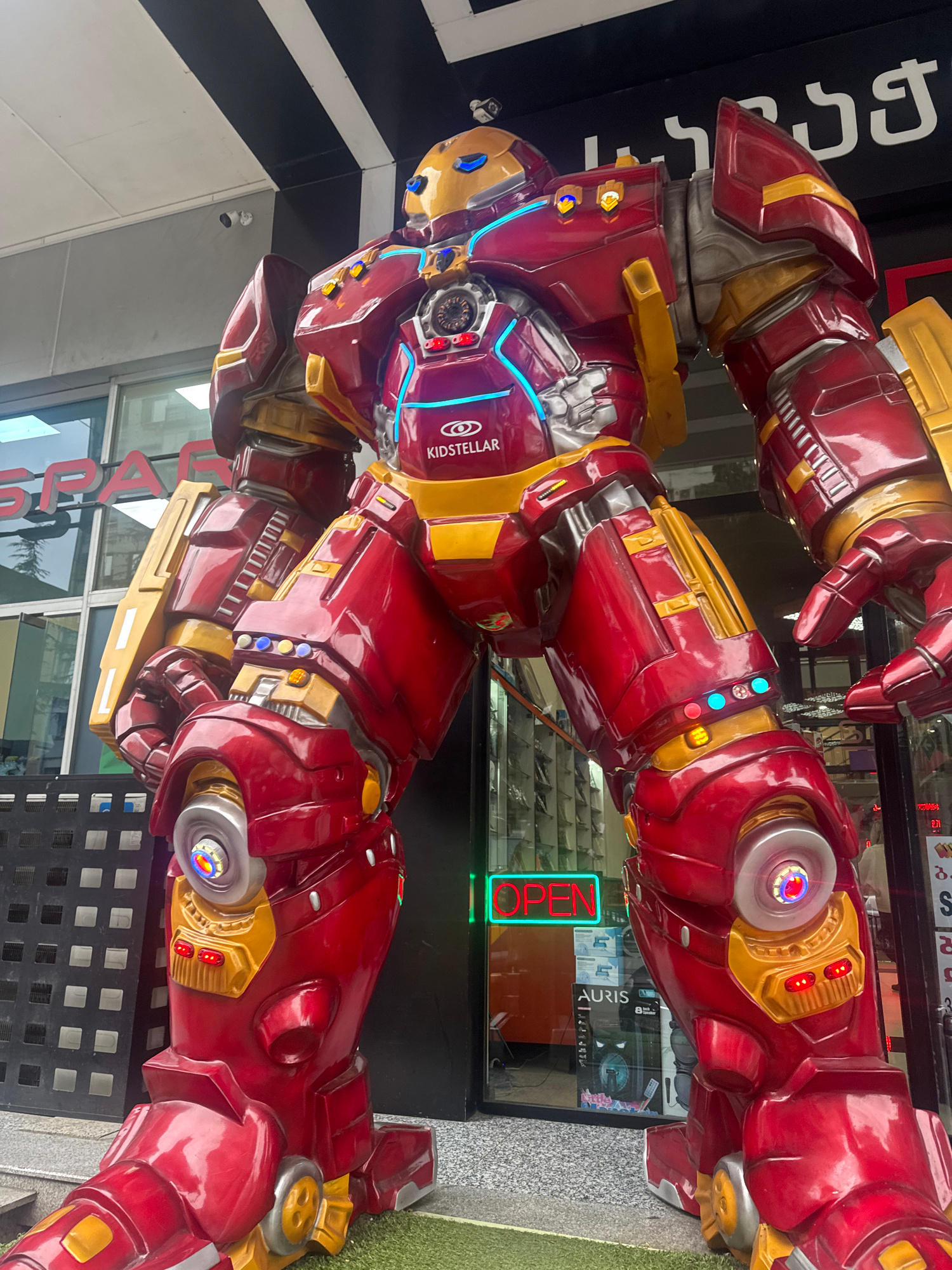 A large, towering humanoid robot statue, predominantly glossy red with matte gold and silver-grey accents, stands upright on artificial green turf in front of a commercial building. The robot's design…read more
