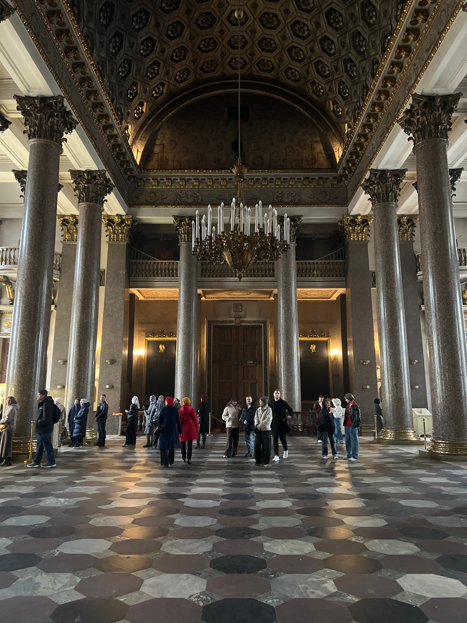 The image shows the interior of Saint Isaac's Cathedral in Saint Petersburg, Russia. A group of people, likely tourists, stand in the central nave, facing away from the camera. They appear to be liste…read more