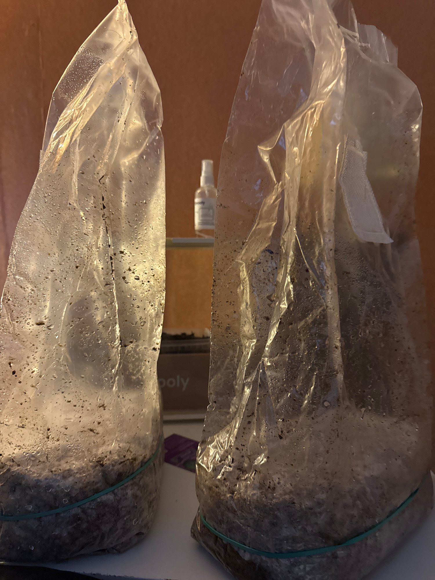 Two clear plastic bags are visible, each containing dark-colored substrate material. The bags are closed and appear to be sealed with elastic bands. The substrate appears to have condensation presentβ¦read more