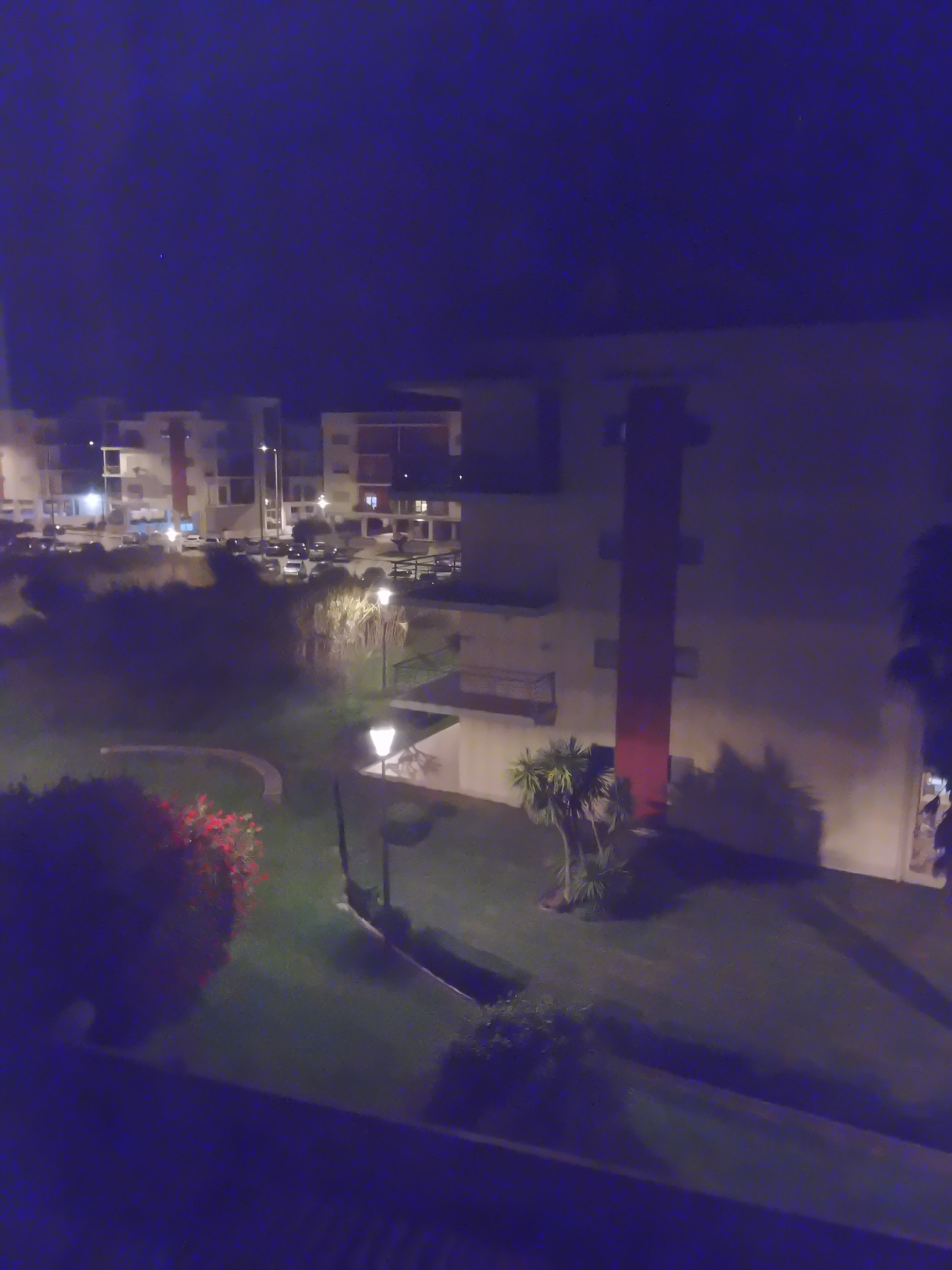The image shows a night view in Figueira da Foz, Portugal. Residential buildings with illuminated windows are visible on the left, extending into the background. Streetlights illuminate a lawn with pl…read more