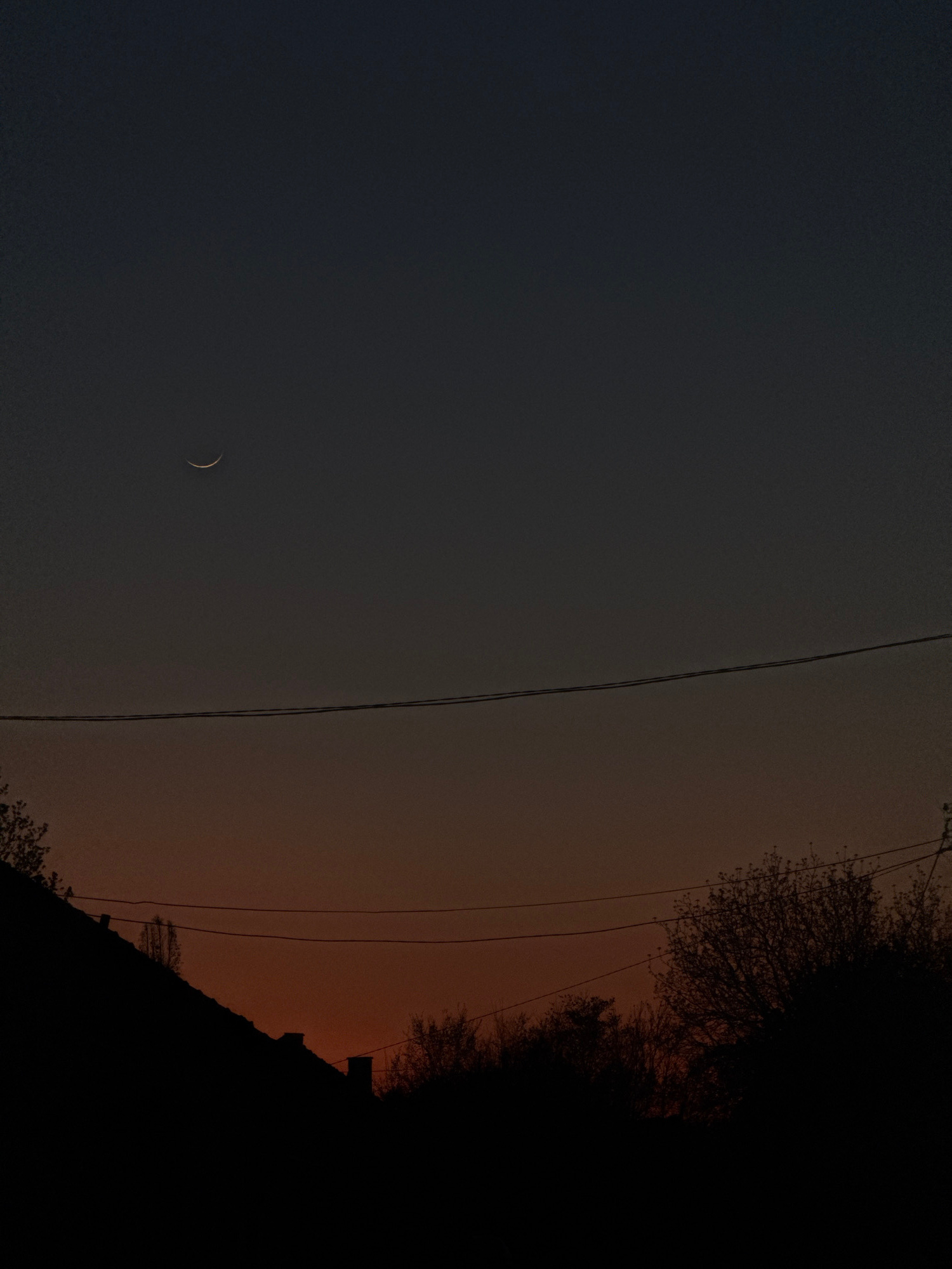 The image shows a crescent moon in the sky. Two electrical wires run vertically through the middle of the frame. The sky transitions from a dark blue on the left to a reddish-orange hue on the right.…read more