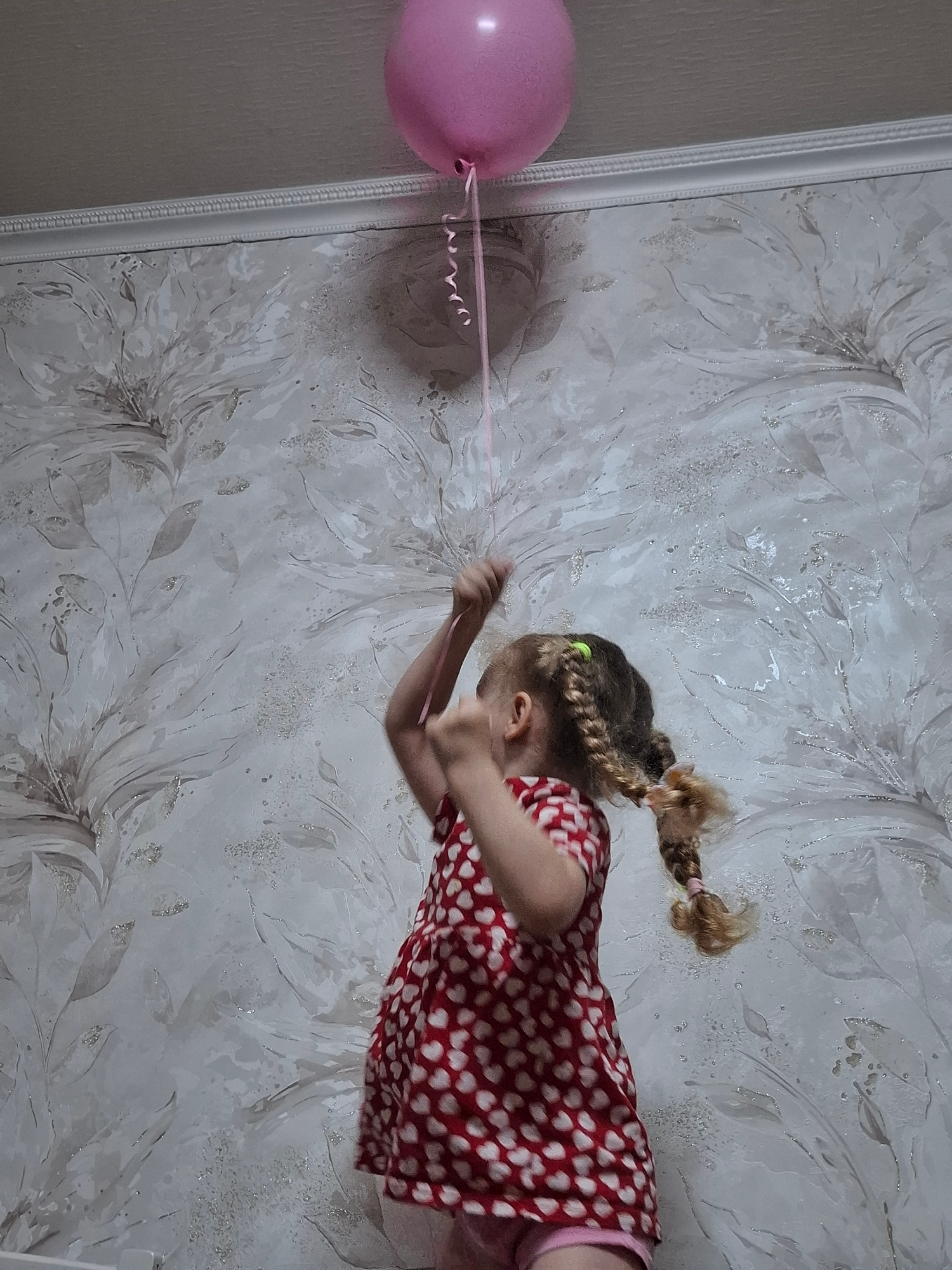 A girl with blonde hair braided into pigtails, wearing a red and white heart-patterned dress, is pulling on the string of a pink balloon. The girl is positioned against a wall with a floral wallpaper…read more
