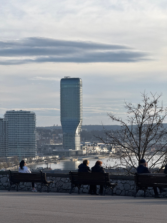 An elevated, long-distance daytime shot captures an urban and riverine landscape in Belgrade, Serbia, under a partially cloudy sky. In the immediate foreground, an asphalt surface transitions to a low…read more