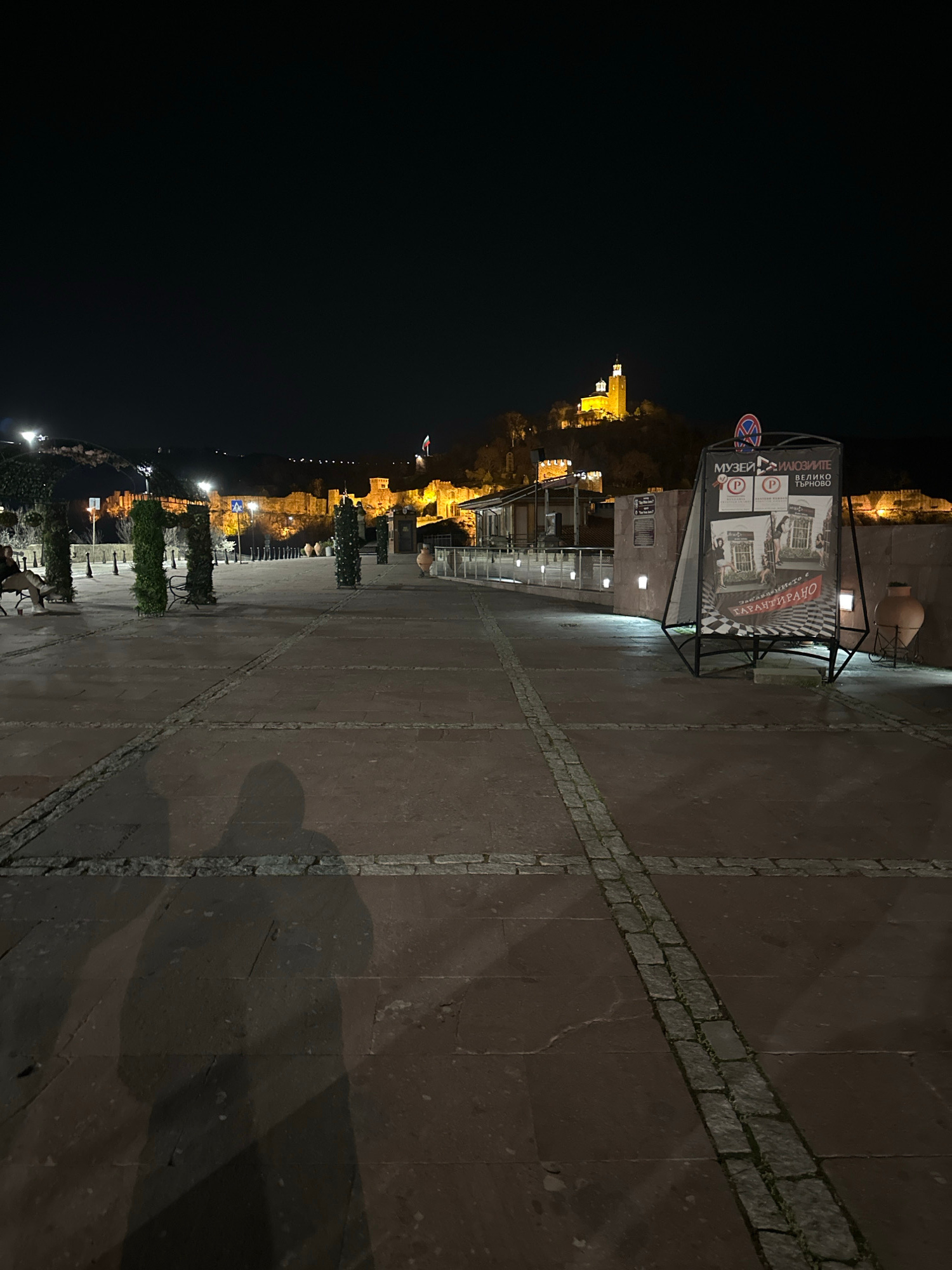 This image shows the Veliko Tarnovo fortress, illuminated at night, in Veliko Tarnovo, Bulgaria. A sign stands on a stone-paved path in the foreground. Lights and structures of varying heights line th…read more
