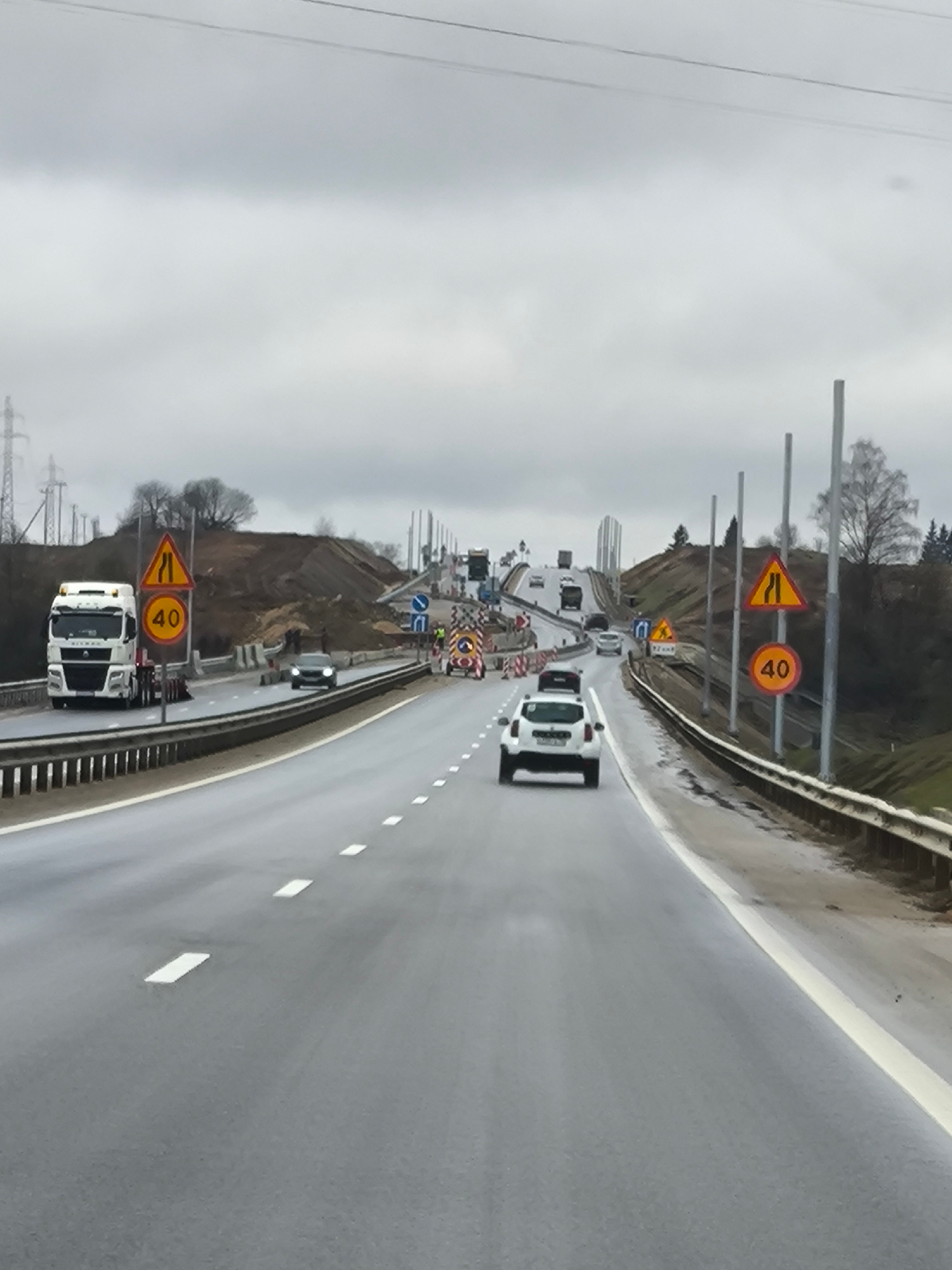 The image captures a daytime scene of a multi-lane highway undergoing construction or maintenance under an overcast sky. The asphalt road appears damp or wet in places. In the foreground, a white SUV…read more