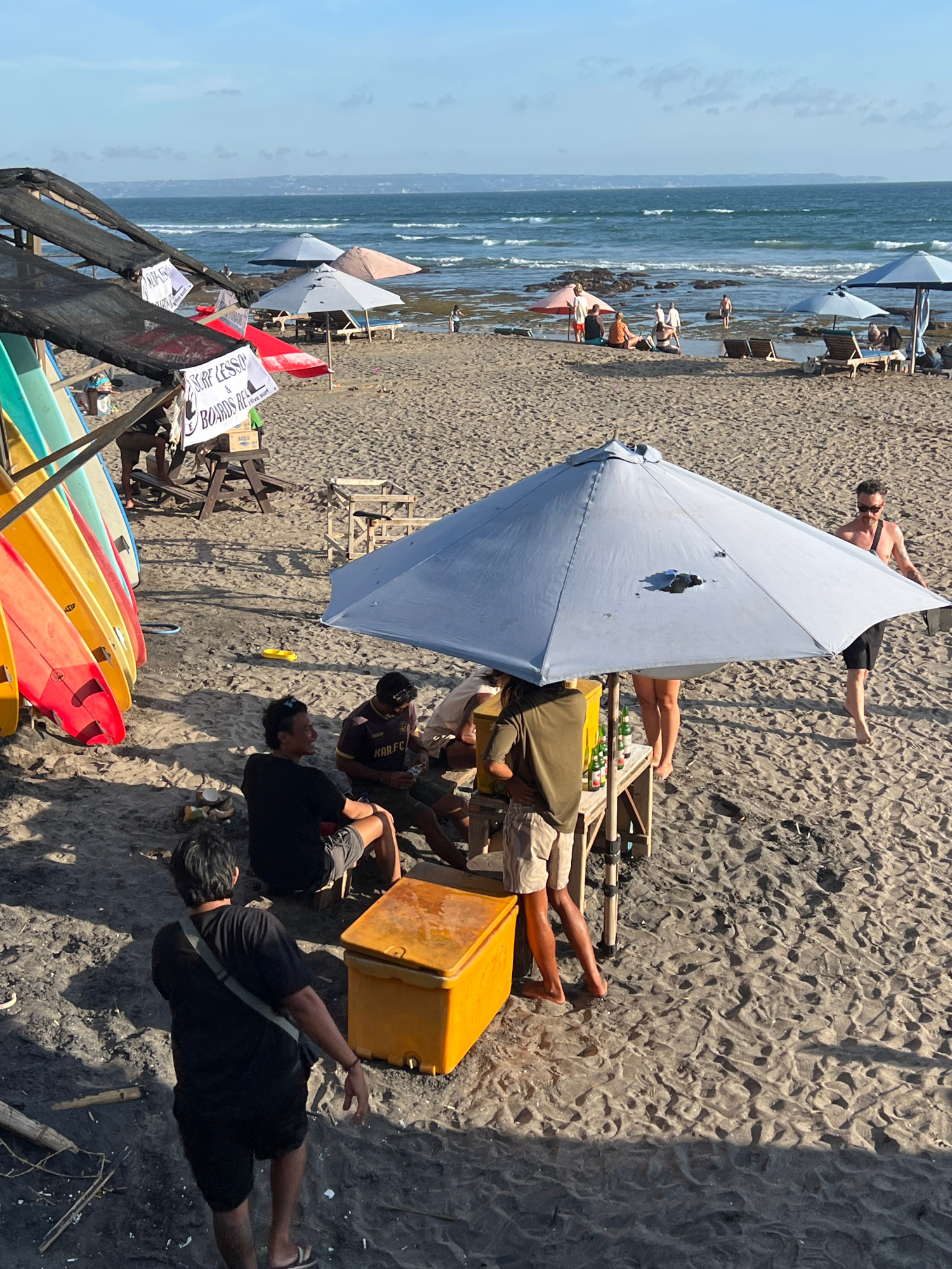 This image was taken in North Kuta, Indonesia on a beach, likely in the Canggu area, characterized by its volcanic black sand. The foreground reveals an assortment of surfboards stacked in a rack alon…read more