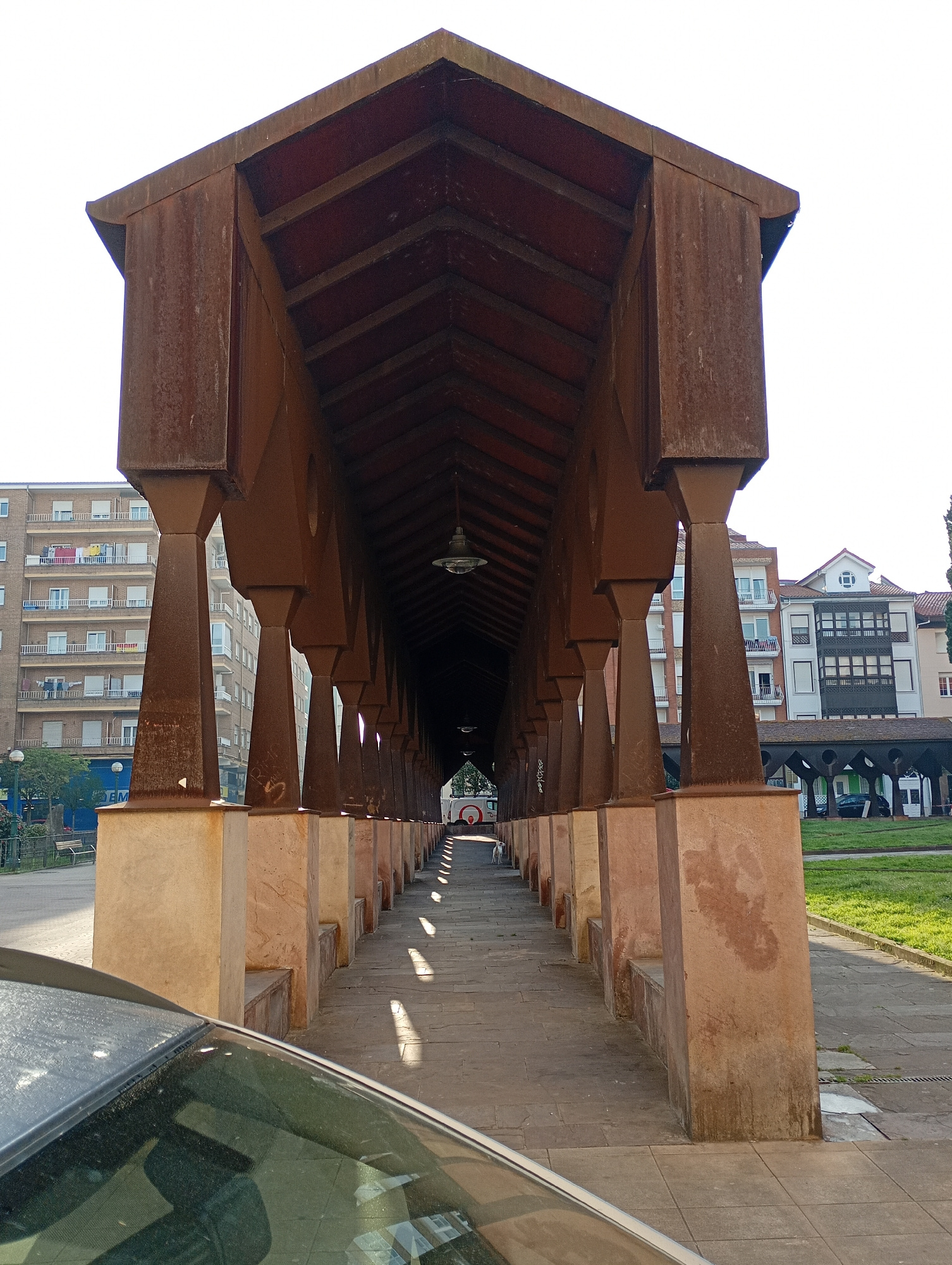 A ground-level, eye-level, daytime shot of the modernist market hall in Torrelavega, Spain. The image shows a long covered walkway made of dark brown metal on top of beige concrete bases with integratβ¦read more