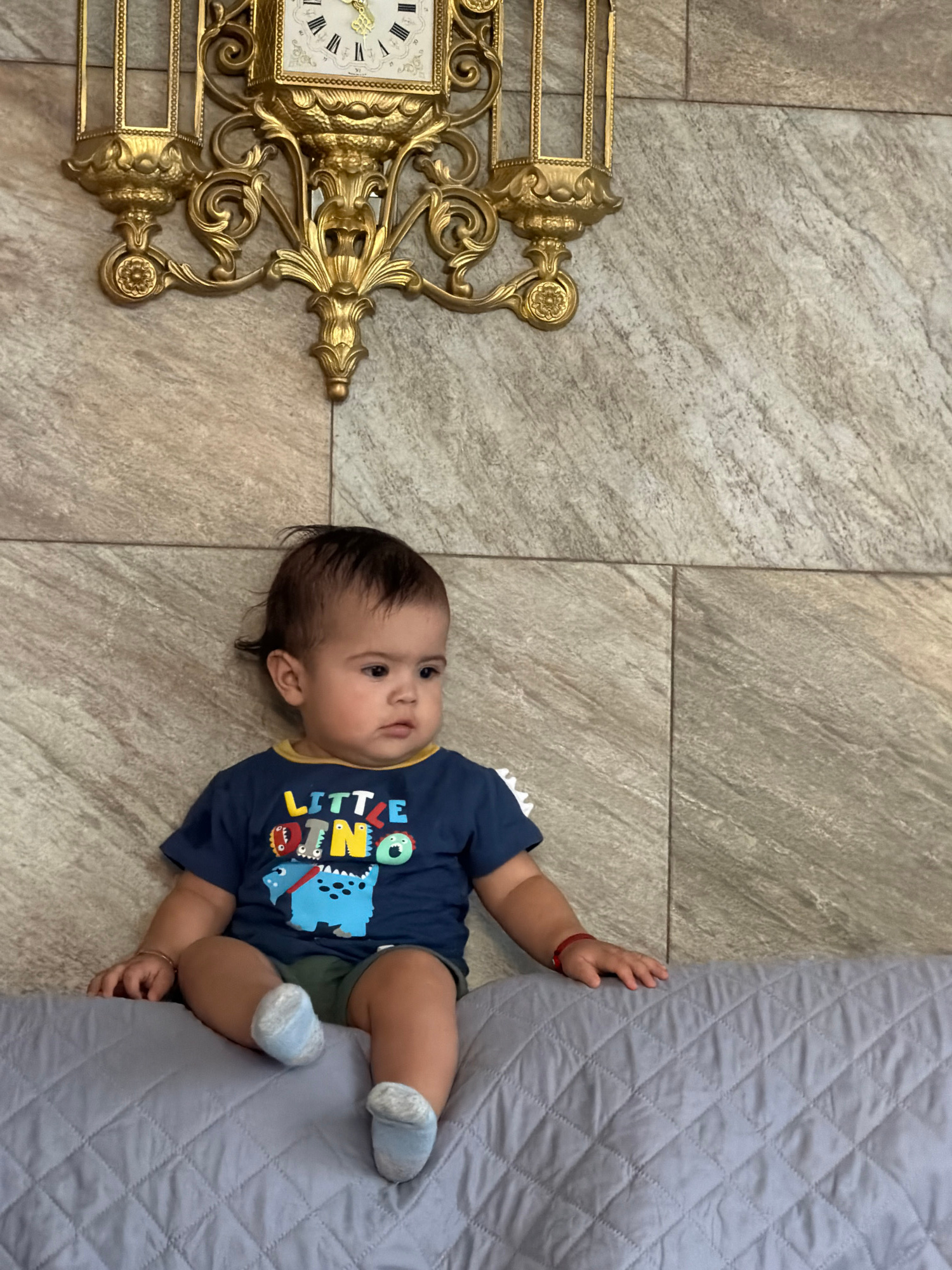 A baby wearing a blue "Little Dino" t-shirt and light blue socks lies on a tan tile floor, partially on a grey quilted pad. To the left, an ornate gold-colored clock is positioned on the same tile. Th…read more