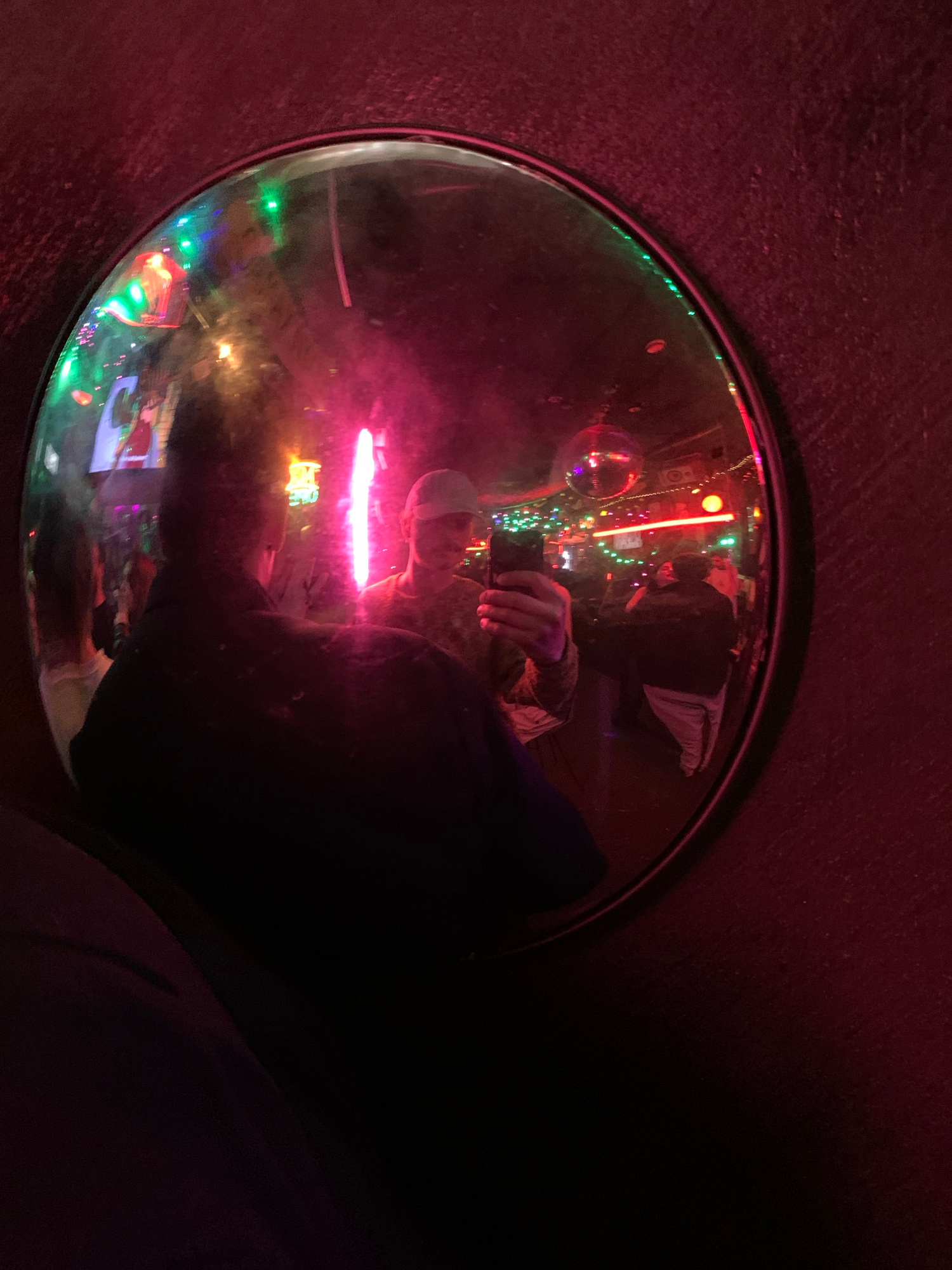 A person is taking a photo through a porthole-style window or opening. The scene inside the window is illuminated with colorful lights, including what appears to be a disco ball and neon signs. The pe…read more