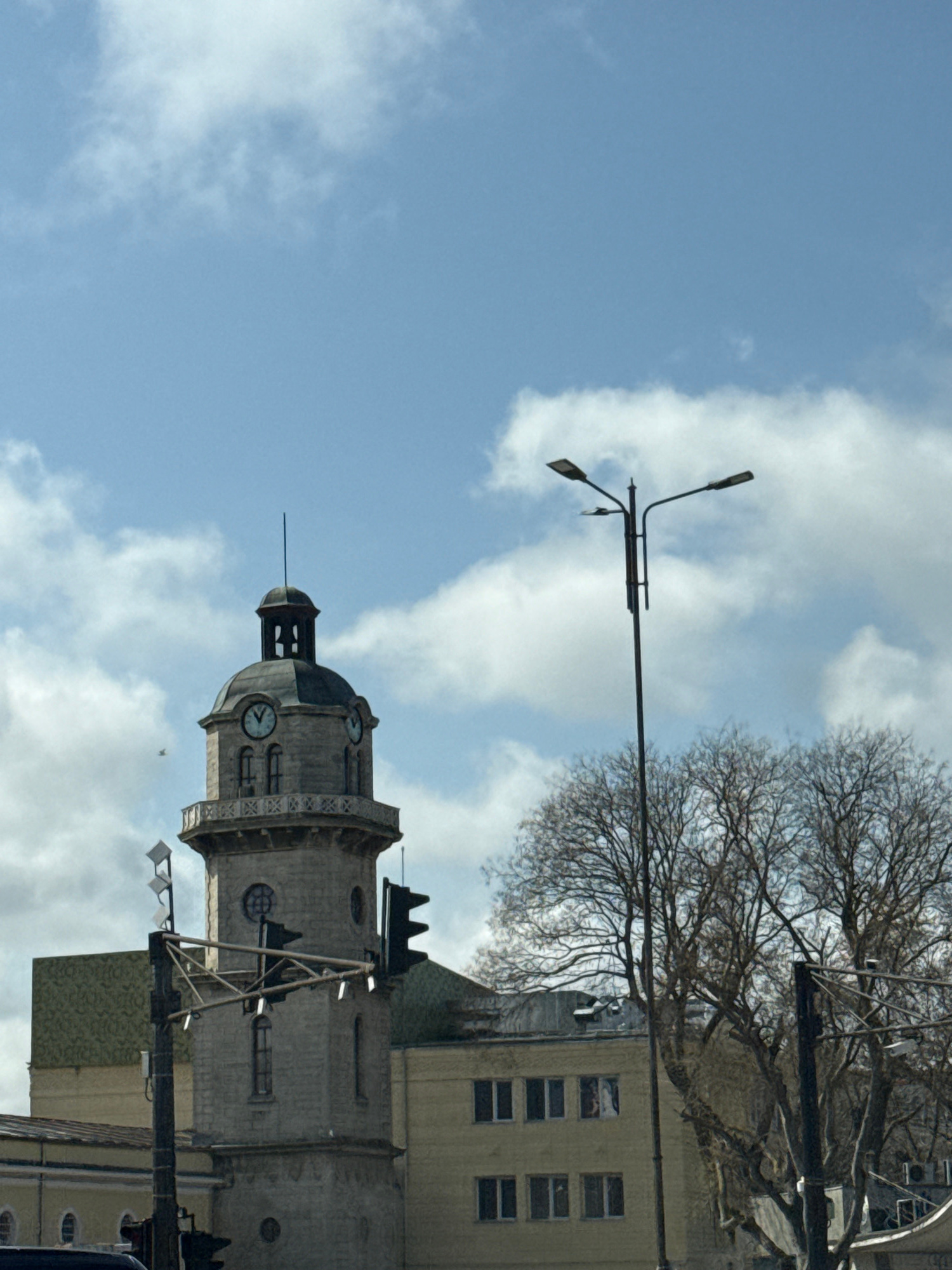The image shows the Varna Clock Tower in Bulgaria against a cloudy sky. A tall lamppost extends toward the upper-left corner. A bare tree branch appears above the tower, near the building on the rightβ¦read more