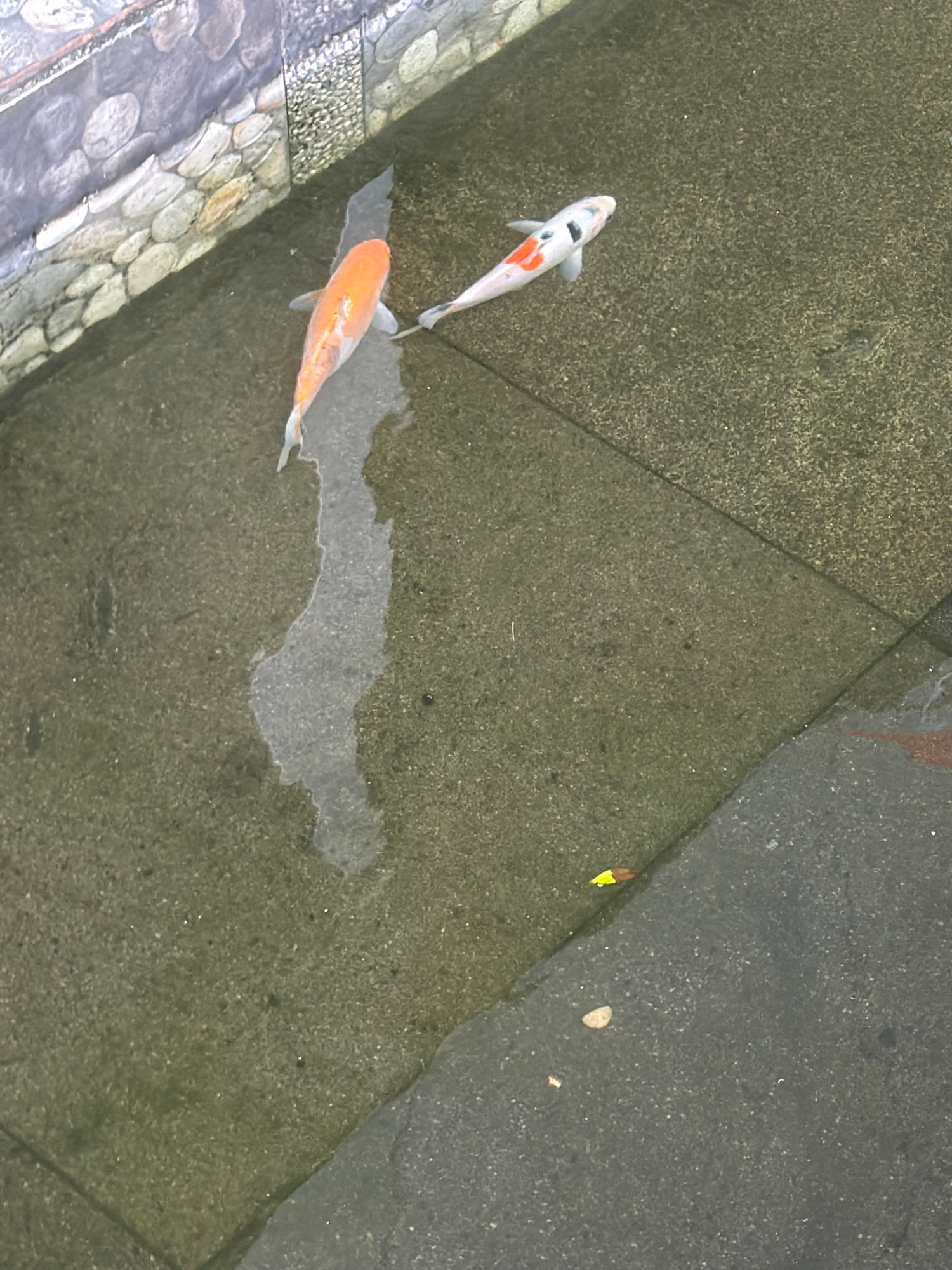 The image shows two koi fish swimming in a shallow pool. One fish is predominantly white with orange markings, while the other is a solid orange color. The pool appears to be constructed of concrete s…read more