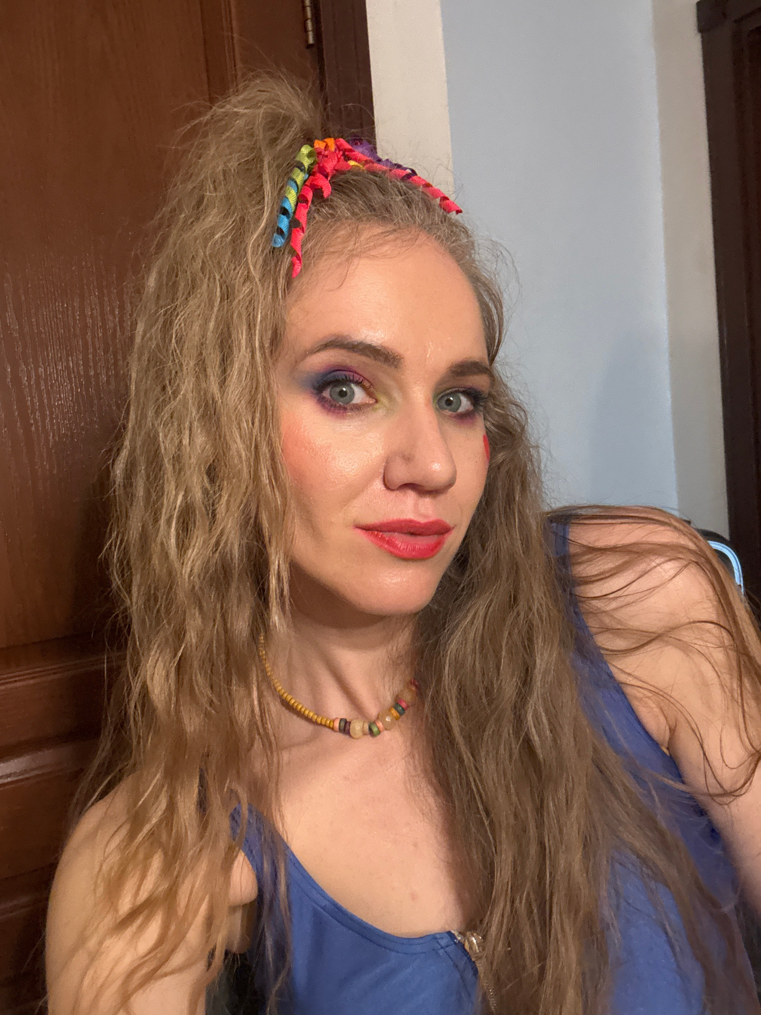A woman with curly blonde hair is facing the camera at an angle. She has blue eyes and is wearing colorful eye makeup and red lipstick. A colorful headband is visible in her hair. She is wearing a blu…read more
