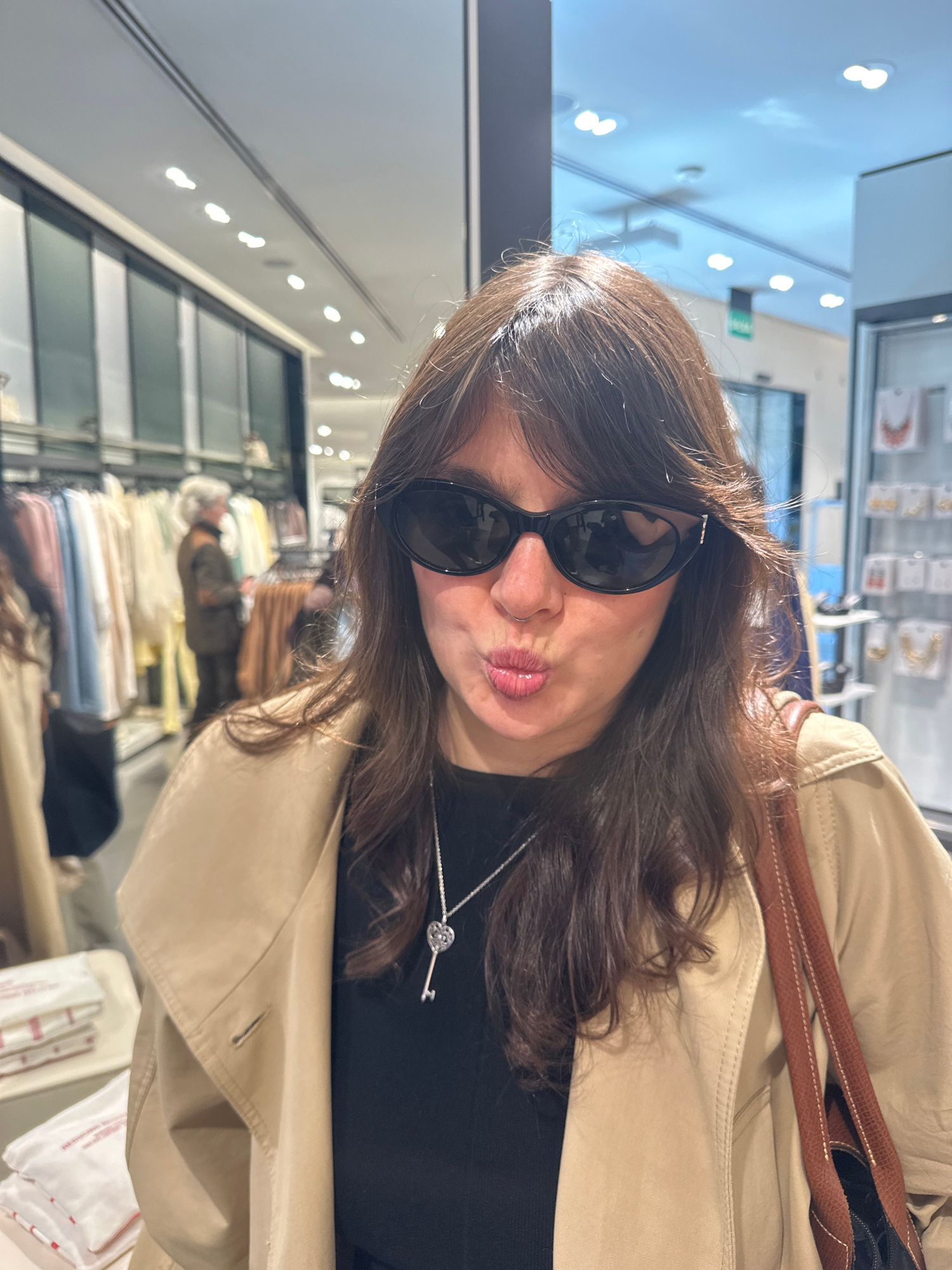 A young adult female is posing for a selfie indoors, likely within a retail environment. She is wearing dark sunglasses, a black top, and a tan trench coat, with a brown shoulder bag strap visible ove…read more
