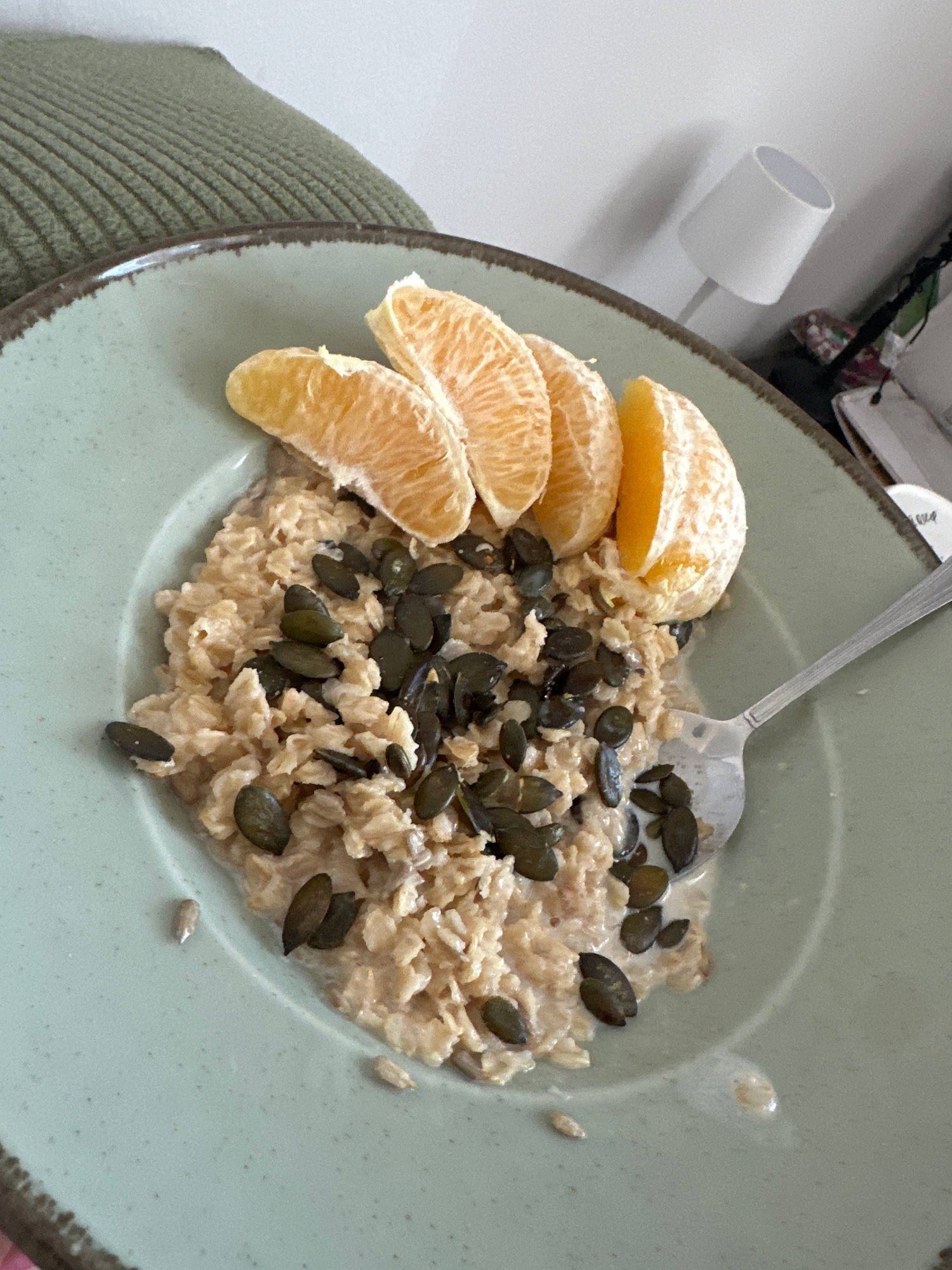 The image depicts a light green plate containing a breakfast dish. The dish consists of oatmeal, topped with dark green pumpkin seeds, and accompanied by sliced orange segments on the side. A silver s…read more