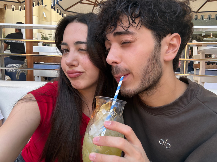 A close-up image depicts two young adults, a female and a male, in an outdoor dining setting in Paradise, United States of America. The female, positioned on the left, has long dark hair, is wearing a…read more