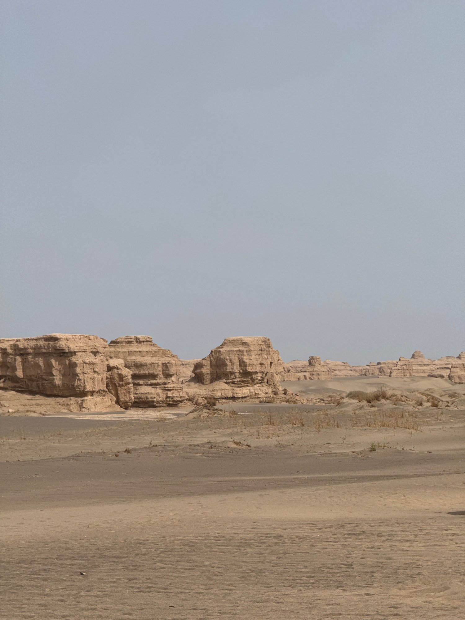 The image shows a geological formation in Dunhuang City, China. The formation is composed of layered rock with a heavily eroded surface, abutting a sandy slope. The sky is overcast and uniformly grey.…read more