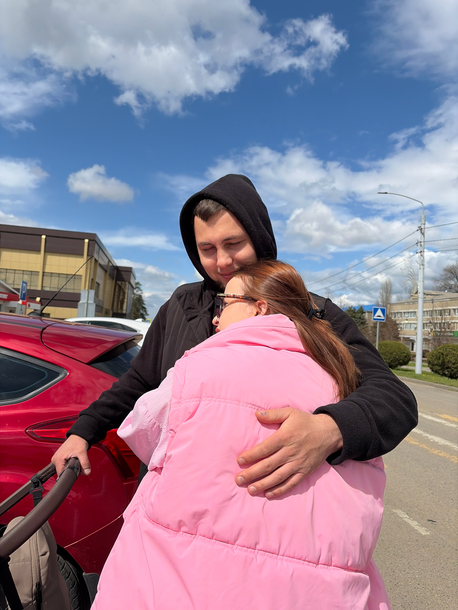 A man wearing a black hoodie and a woman in a pink jacket are hugging in front of a red car and a baby stroller. The location is Novopokrovskaya, Russia, as suggested by the surrounding buildings and…read more