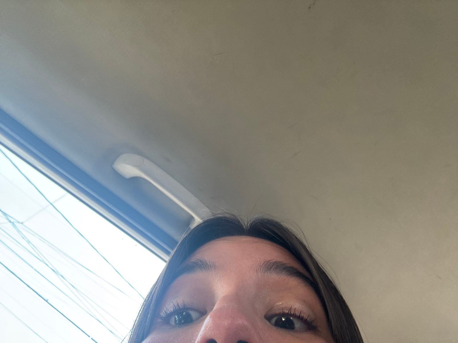 A person with dark hair, positioned upside down, is looking into the camera. The image appears to be taken from inside a vehicle, with the car's interior roof and window visible. The window shows some…read more