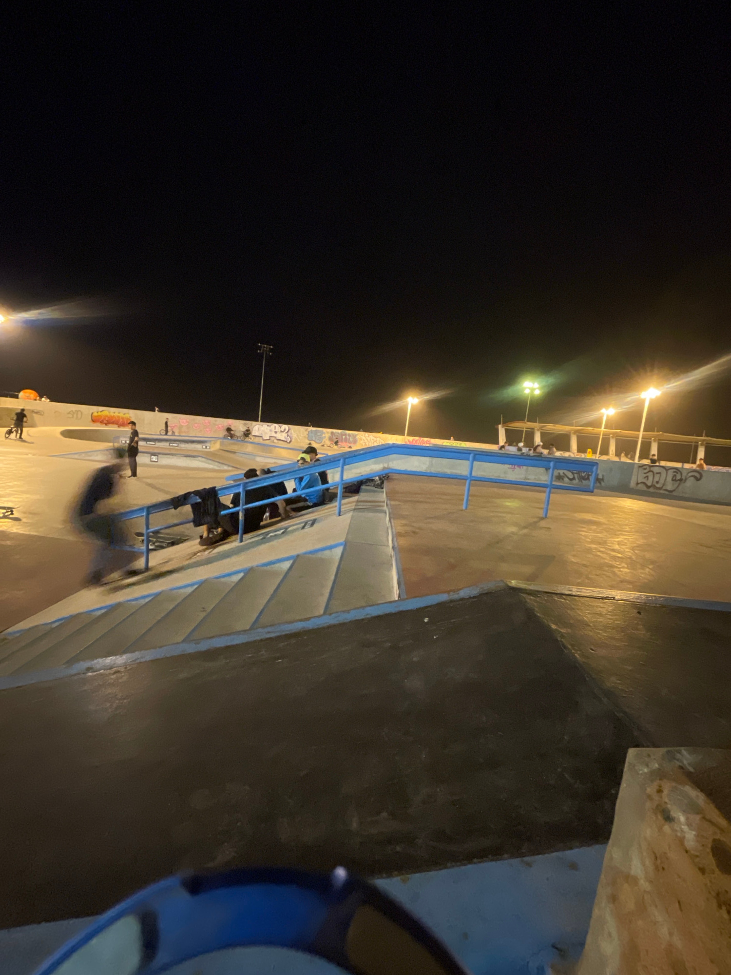 The image shows an outdoor skatepark at night in Iquique, Chile. Several streetlights illuminate the park. People are sitting on the blue-railed edge of a ramp. Graffiti covers some of the surfaces. T…read more
