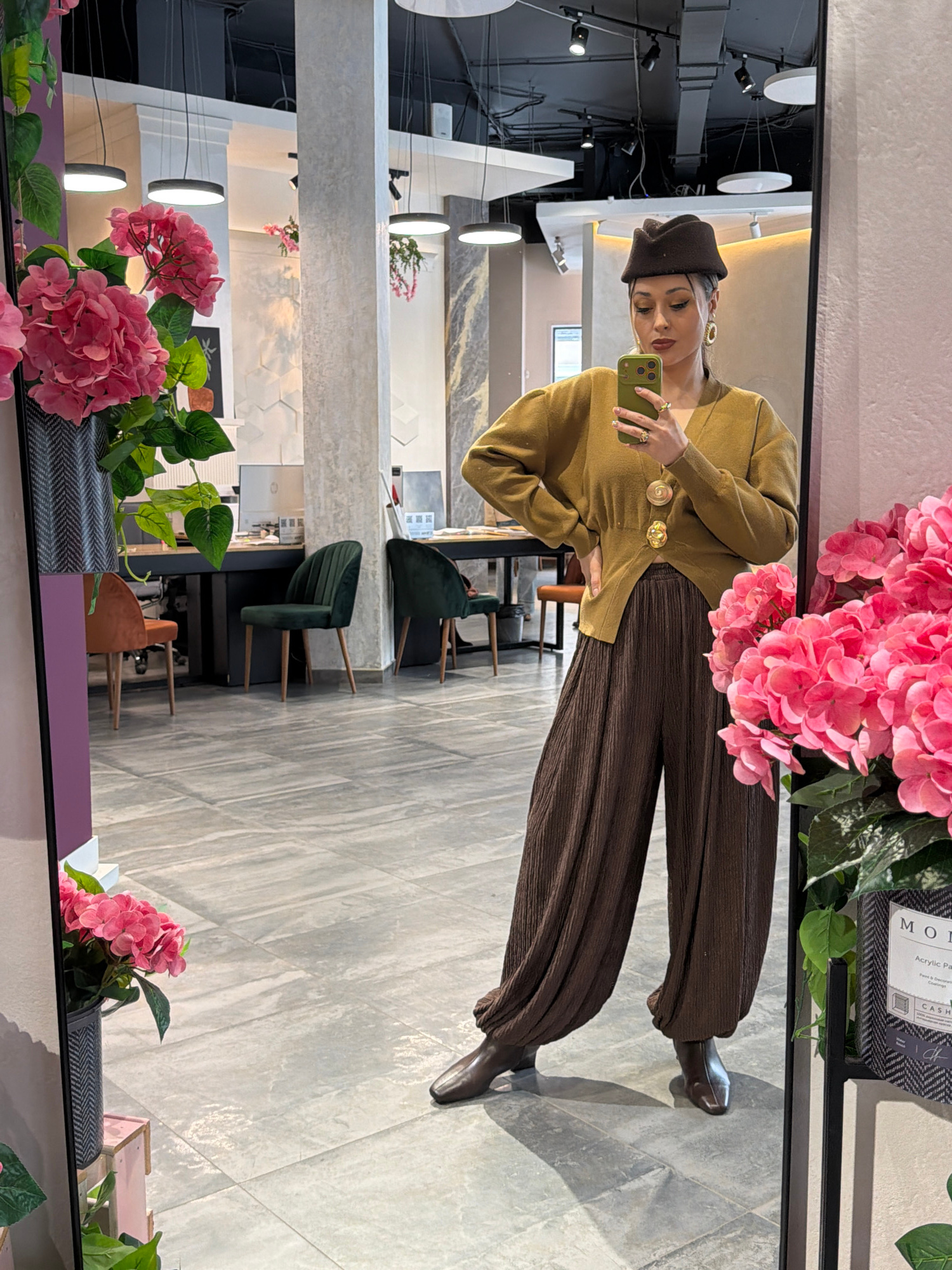 A woman is captured in a mirror selfie, posing in a modern interior space, likely a showroom or boutique in Krasnoyarsk, Russia. She is wearing a mustard yellow cardigan with prominent gold buttons, d…read more