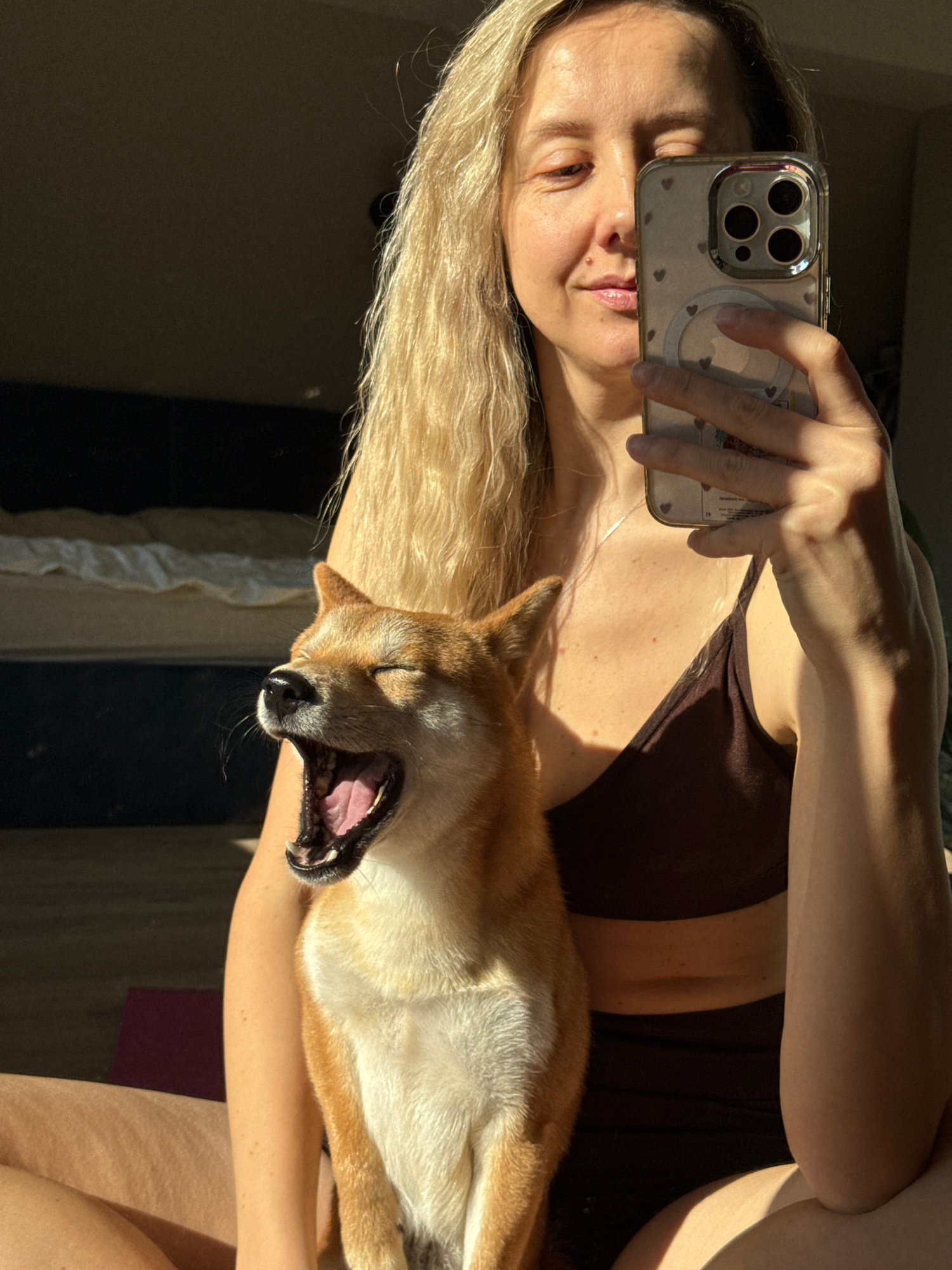 A light-skinned woman with long blonde hair is lying down, holding a smartphone in her left hand and taking a selfie with a tan Shiba Inu dog that is yawning widely. She is wearing a dark brown athletβ¦read more